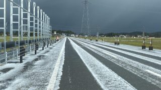 おはようございます。今朝はいい天気になりました。昨日の荒天がウソの様です。遠くの頸城三山は高いところが雪に覆われていて輝いています。トップのイラストは雹(ひょう)が降ったあとの新井柿崎線。下は今朝の頸城三山です。