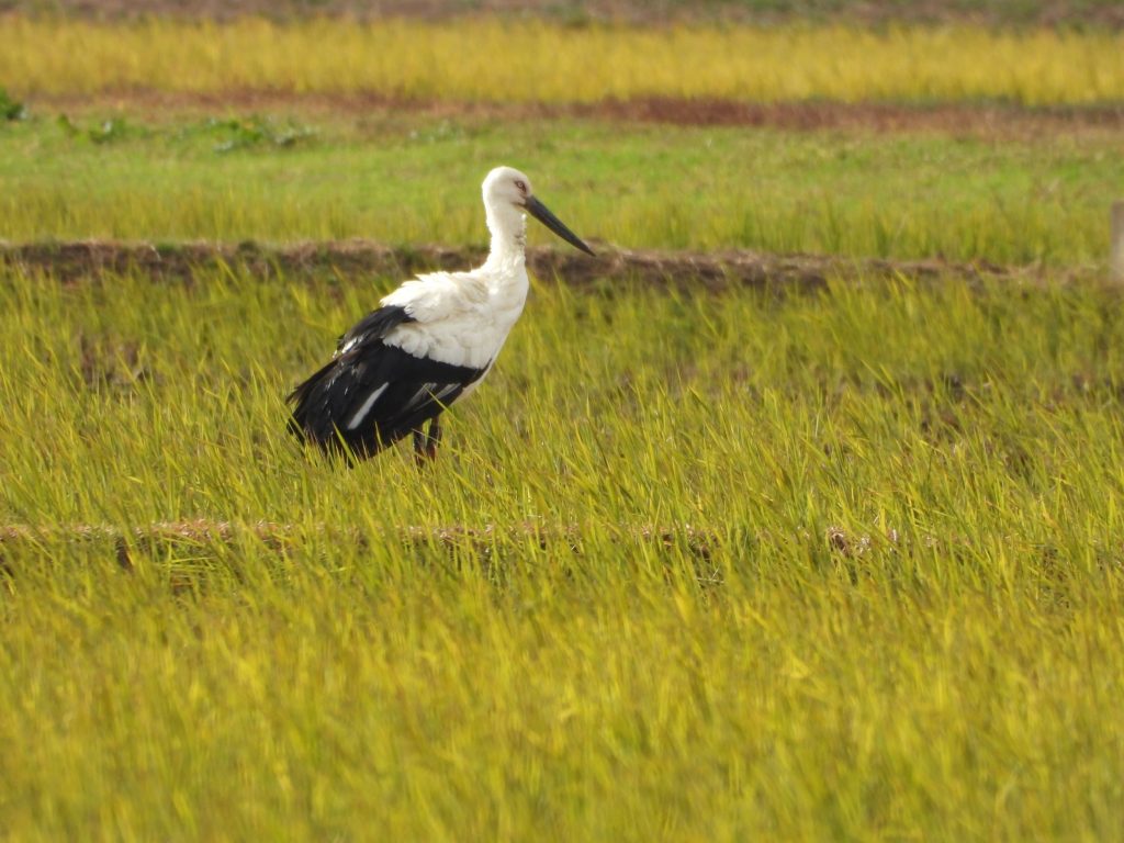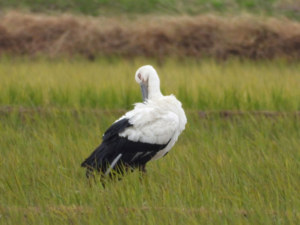 昨日は雨と風に泣かされました。朝市宣伝に向かう途中、雨がひどくなり、途中で断念しました。行ったとしてもお店はいくつも出ていないし、お客さんも来ないだろうと勝手に判断しました。それで、コウノトリの様子を見てから直江津に行くことにしました。前日、ほぼ1週間ぶりに2羽見かけたのですが、昨日は汚泥リサイクルパーク付近の田んぼに1羽だけいました。強い雨が降ったこともあって、足環の泥が落ちたのでしょうか、昨日は個体番号をしっかりと確認できました。いたのは昨年5月、吉川で誕生した4羽のうちの1羽、個体番号がJ0792のメスでした。時々、キョロキョロしていましたから、仲間が来るのを待っていたのかも。トップ及び下の写真は、そのコウノトリです。