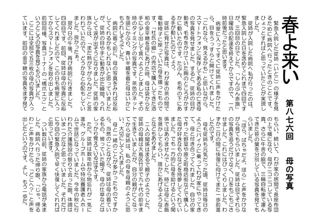 活動レポート2229号、「春よ来い」シリーズの第876回、「母の写真」をホームページに掲載しました。ご笑覧ください。