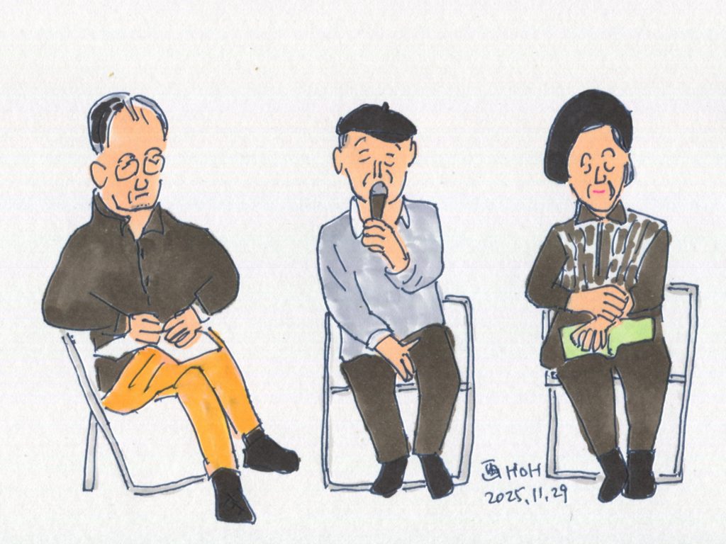 映画は1本目の「『里山』のふところ」と3本目の途中から観ました。1本目のドキュメンタリー映画の舞台は何度も訪れている桑取の暮らしです。映像がじつに美しく、農作業、祭りなど地域の人たちの暮らしぶりがとても楽しく描かれていました。しかもカメラの視点が面白い。ヤマボウシの花の中心部をクローズアップしたり、猫が稲の穂にさわったり……。とても親しみを感じました。3本目の「ごはん」は稲作の入門映画であり、親子の心の動きを追った愛情物語でもありました。たんたんと描いている映画なのに、途中から涙が止まりませんでした。大野さんなどとの「映画振り返りトーク」も面白かったです。トップのイラストは1本目の映画のワンシーンを描きました。下は「振り返りトーク」です。