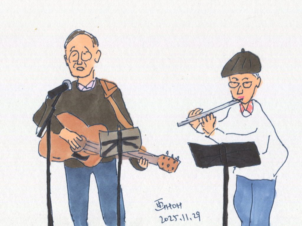 ミニコンサートは今回も山岸協慈さんのギターと平沢栄一さんの歌でした。山岸さんの演奏はここでしか聴けないので、いつも楽しみにしています。美味しいトマトを栽培している人が素敵なギタリスト。農業映画祭での演奏者として最高の一人です。平沢さんの歌のそばに今回はフルートの山崎美矢子さんがおられました。私が初めてフルートの演奏と出合ったのは山崎さんの演奏でした。「こんなにもきれいな音がでるのか」と惚れ惚れしたものです。平沢さんの歌にフルートの演奏、とても良かったです。