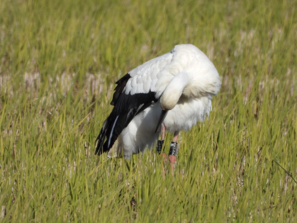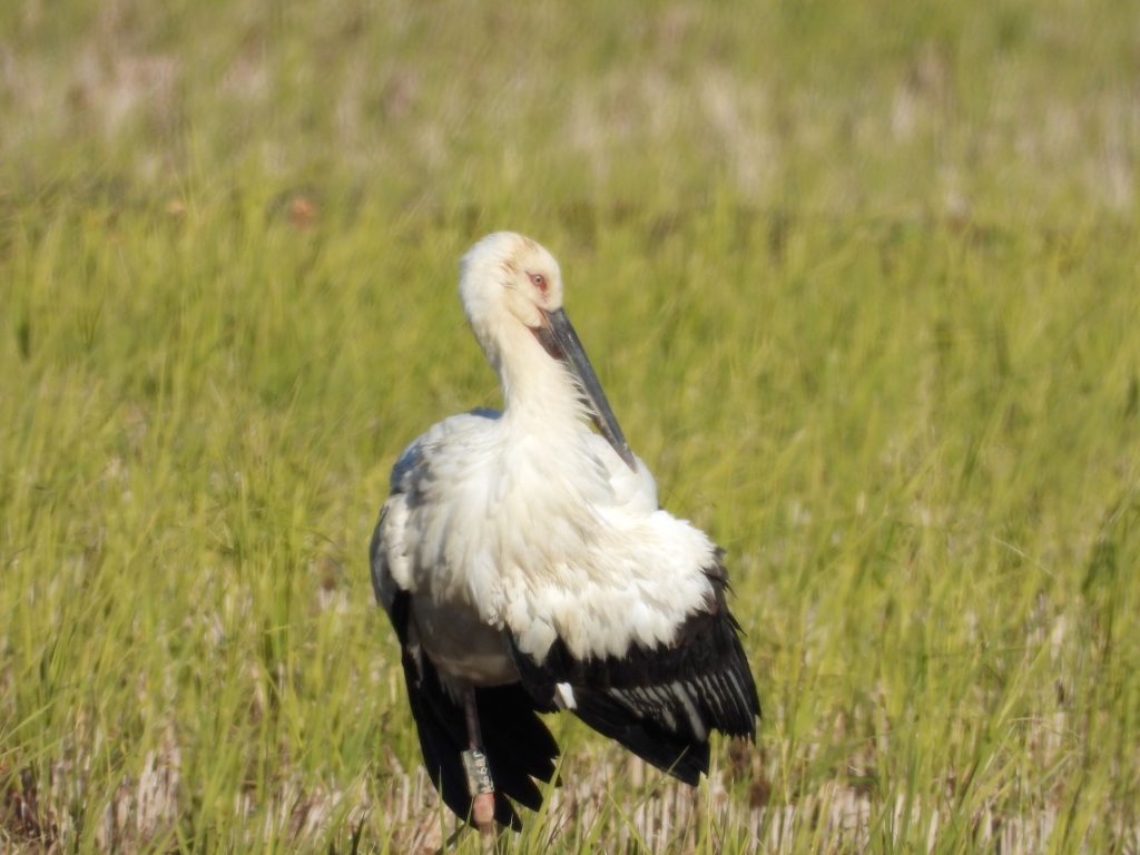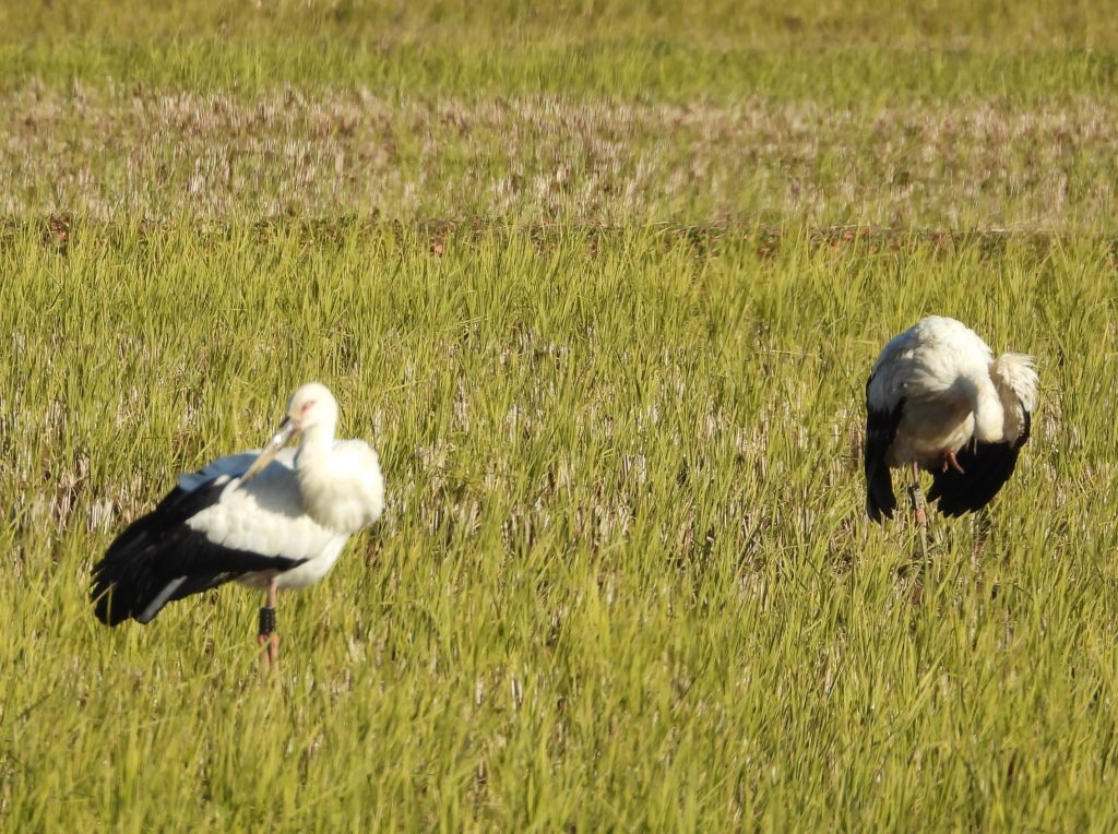 昨日は直江津に行く際、汚泥リサイクルパークをまわりましたが、その付近の田んぼに2羽のコウノトリがいました。1羽は昨年5月、吉川区で生まれたメス(個体番号J0792)、もう1羽は今年6月茨城県神栖市で生まれたメス(個体番号J0951)でした。茨城県からのコウノトリのお客さんは初めて見ました。今回は足環がはっきりと見えました。