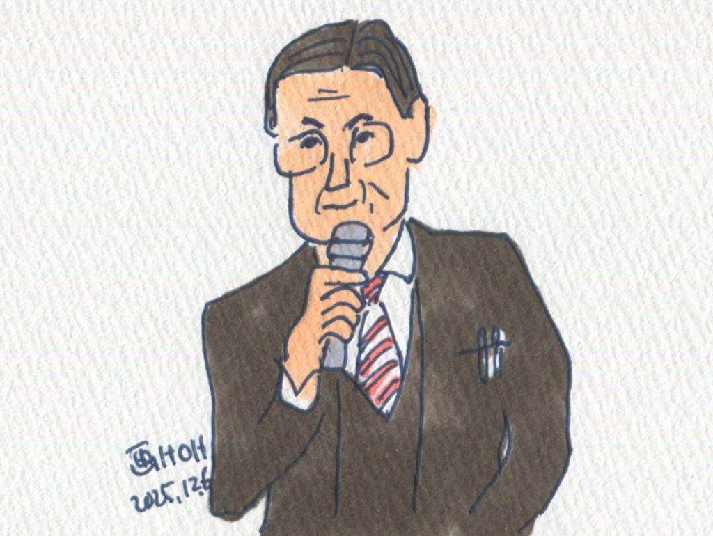 午後からは市民プラザで上越革新懇の講演会でした。講師は頸城区出身で法政大学名誉教授の五十嵐仁さん。「激動期を迎えた日本 新しい国民的共同を」と題して1時間半近く話していただきました。五十嵐さんの講演はいつもわかりやすく、ジョークも多用、何度も笑いながら楽しく聴くことができました。現在の高市政権について、「いままでの自民党と違う。好き勝手なことを次々とやっている」と批判しました。そのうえで、極右反動ブロックの暴走、戦争準備とスパイ防止法、要求実現に向けての国民的な共同について語りました。印象に残ったことの1つは、反差別共闘を重視されていたことです。共生で選ばれる国になろうという提起は重要だと思いました。国民的な共同として、戦争法以来の実績を、多様なレベルの共同を重視するという提起も共感しました。下のイラストは五十嵐さんです。
