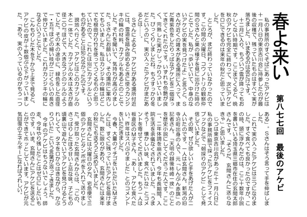 活動レポート2230号、「春よ来い」シリーズの第877回、「最後のアケビ」をホームページにアップしました。ご笑覧ください。