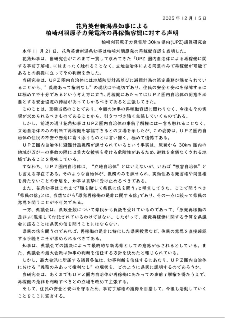 本会議が終わってすぐに市長と面会しました。柏崎刈羽原子力発電所30㌔圏内UPZ議員研究会メンバー4人(日本共産党議員団3人と滝沢一成議員)で応接室に行き、原発再稼働について、新潟県の花角知事がUPZ圏内の自治体の事前了解権にふれることなく容認したことを批判した声明文を小菅市長に渡しました。トップのイラストはその時の様子を描きました。下は声明文です。