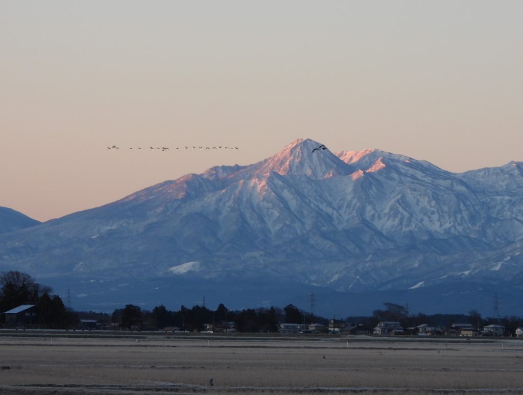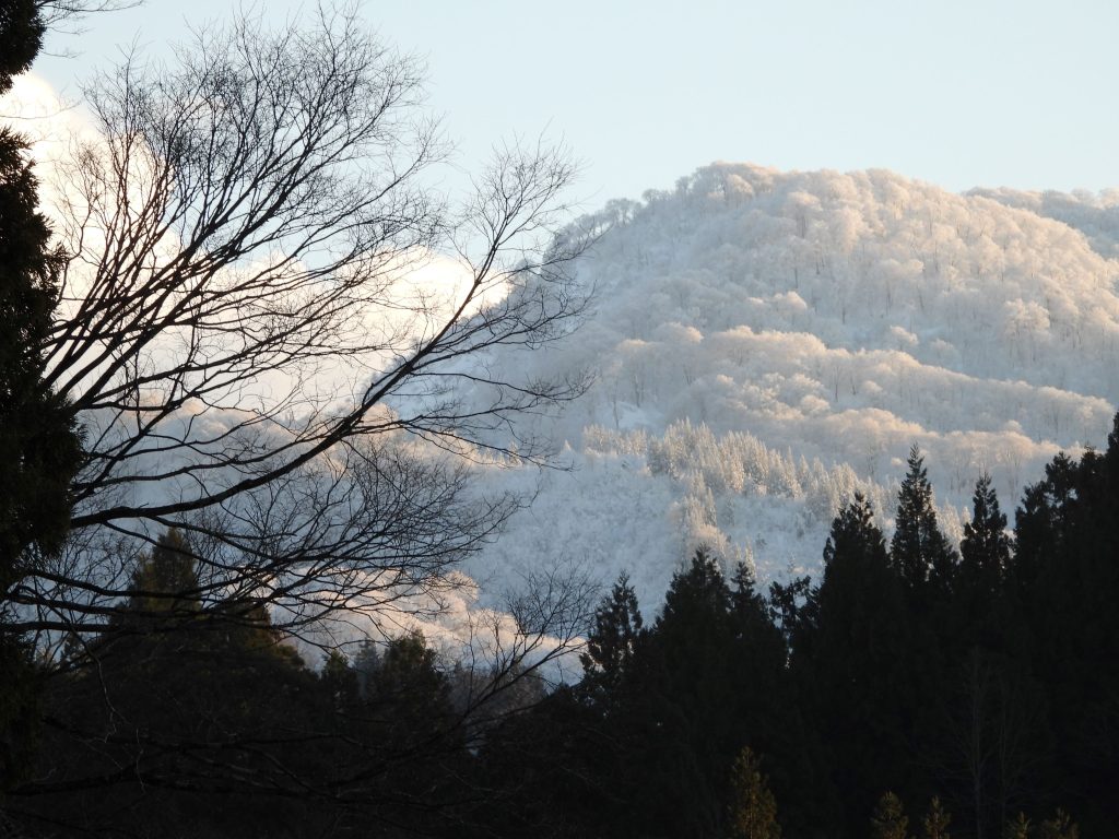 大島区では、菖蒲まで行って、県境の山々が夕日を浴びて輝いている姿を見ました。雪は少なかったものの、山は新雪に覆われていてとても美しかったです。下は県境の山の写真です。この山を越えると長野県栄村です。