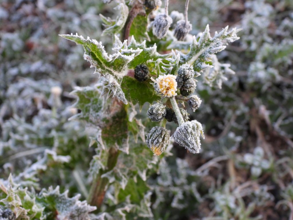 おはようございます。今朝は寝坊して6時過ぎに起床しました。「しんぶん赤旗」日刊紙の配達当番を忘れていたわけではないのですが、起きれなかったのです。でも、寝坊したおかげで、早朝の美しい風景を何枚も撮影できました。今朝は冷え込みが厳しかったので、霜が降りていました。下の写真は妙高山と霜が降りた野の花です。