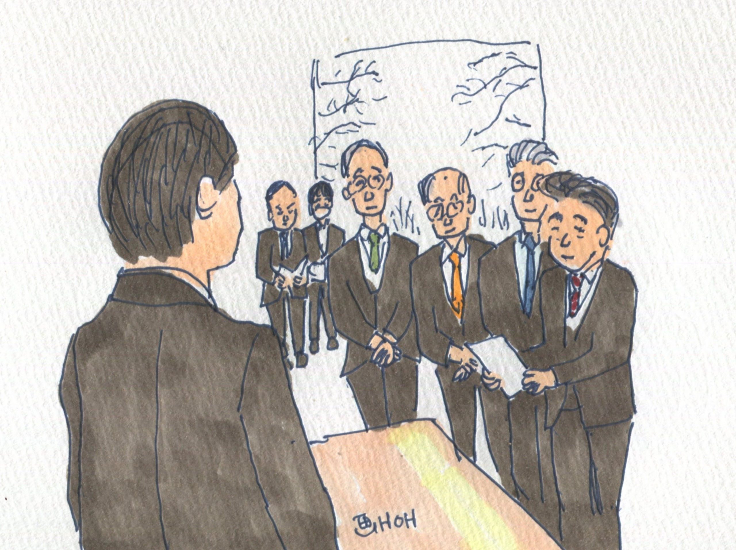 本会議が終わってすぐに市長と面会しました。柏崎刈羽原子力発電所30㌔圏内UPZ議員研究会メンバー4人(日本共産党議員団3人と滝沢一成議員)で応接室に行き、原発再稼働について、新潟県の花角知事がUPZ圏内の自治体の事前了解権にふれることなく容認したことを批判した声明文を小菅市長に渡しました。トップのイラストはその時の様子を描きました。下は声明文です。