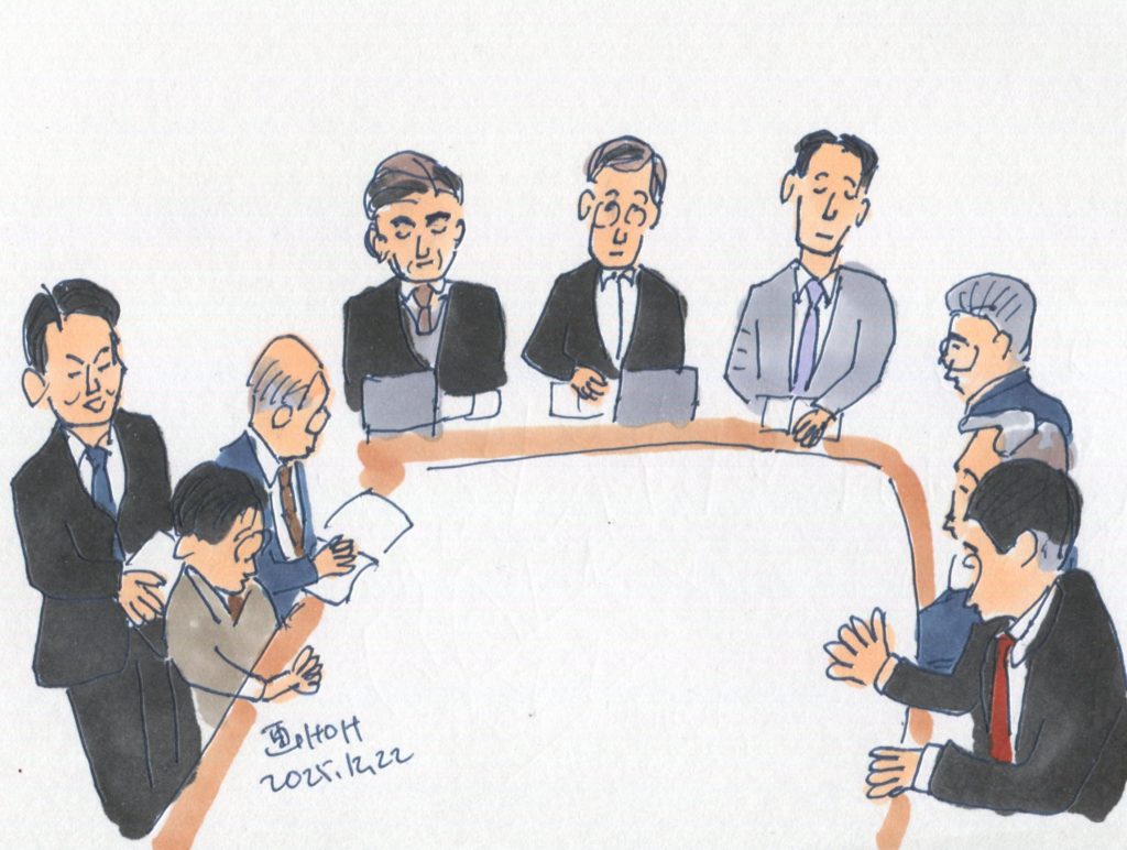 午後からは農政建設常任委員会の所管事務調査でした。テーマは上越市の食料・農業・農村基本計画の見直しです。これまでの計画に基づく取組でどういう成果と課題があるのか、今後、令和12年までの後期計画をどうするのか、注目しました。委員会では、委員外の議員の発言も委員長の許可があれば認めてもらえるので、私からは、「農林業センサス調査結果で過去5年間の基幹的農業者が3割も減っている。ここ上越でも同じだと思う。それだけにこれからの5年間の取組が極めて大事となる。審議会ではこの点を意識した議論があったか」「担い手の中でも新規農業者をどう確保するかが大事なポイントの一つだ。令和12年には35人の新規就農者を見込んでいるが、現実に展望はあるのか」などと質問しました。審議会での議論には私が意識したような議論は少なかったようです。35人という設定はこれまでの実績での数値を基に少なめに設定したとのことでした。新規就農者の中には法人に採用された若い職員さんも入っているとか。新規就農者の実態を正確につかむこと、農業の担い手をどうするかは大きな課題です。今後、どこかでじっくり議論する予定です。下は委員会審査の様子を描きました。