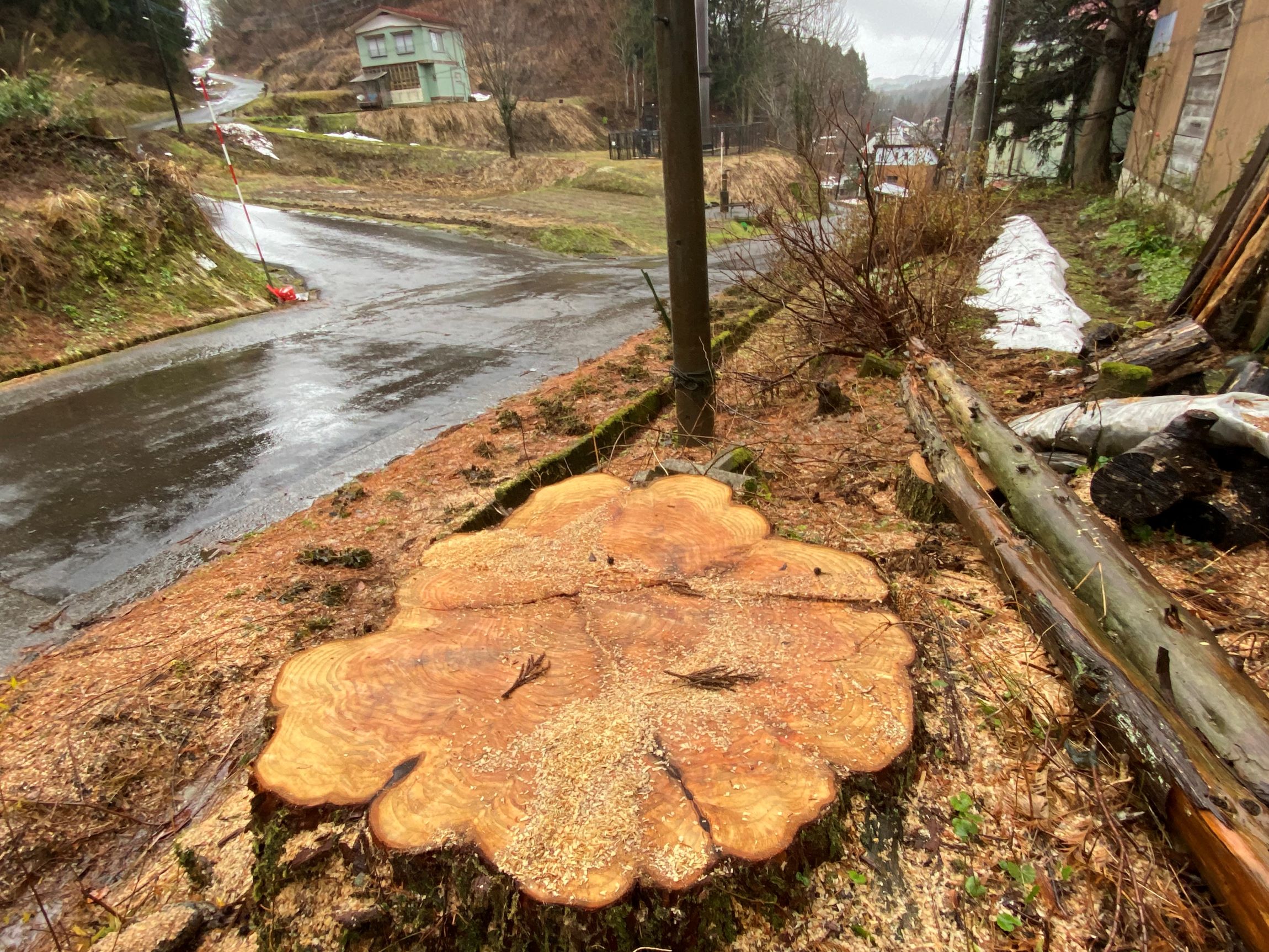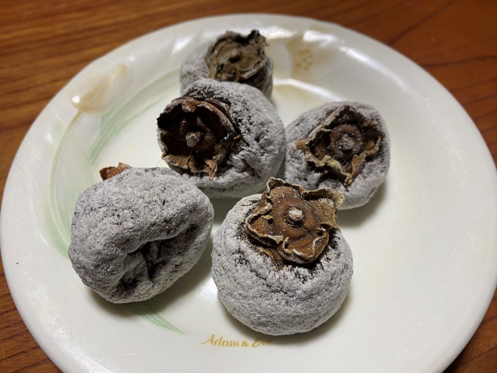 大島区では従兄の家でお茶をご馳走になってきました。従兄の嫁さんの姉妹の人が作ったという干し柿や白菜漬けなどをご馳走になりました。干し柿は見事に粉がふいていて、美味しかったです。従兄の家では、車を止めた場所に立って、「何かおかしいな」と思ったら、入口付近に立っていた大きなメタセコイアが切り倒され、無くなっていました。トップ画像がそれです。下は干し柿です。