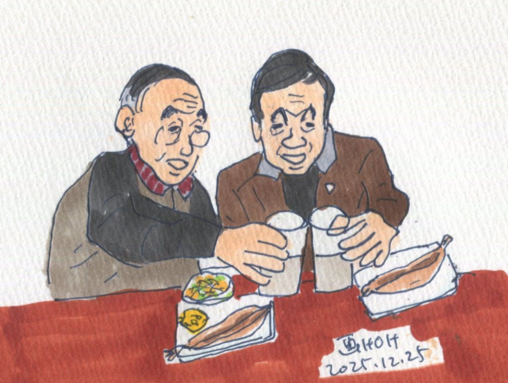 夕方、近くの友人とともに居酒屋に行ってくつろぎました。居酒屋さんでは知り合いの人もいて、政治の話、昔の仕事の話などたっぷりしました。その後、友人とカラオケにも行きました。帰宅したのは10時過ぎとなりました。下のイラストは居酒屋での風景です。