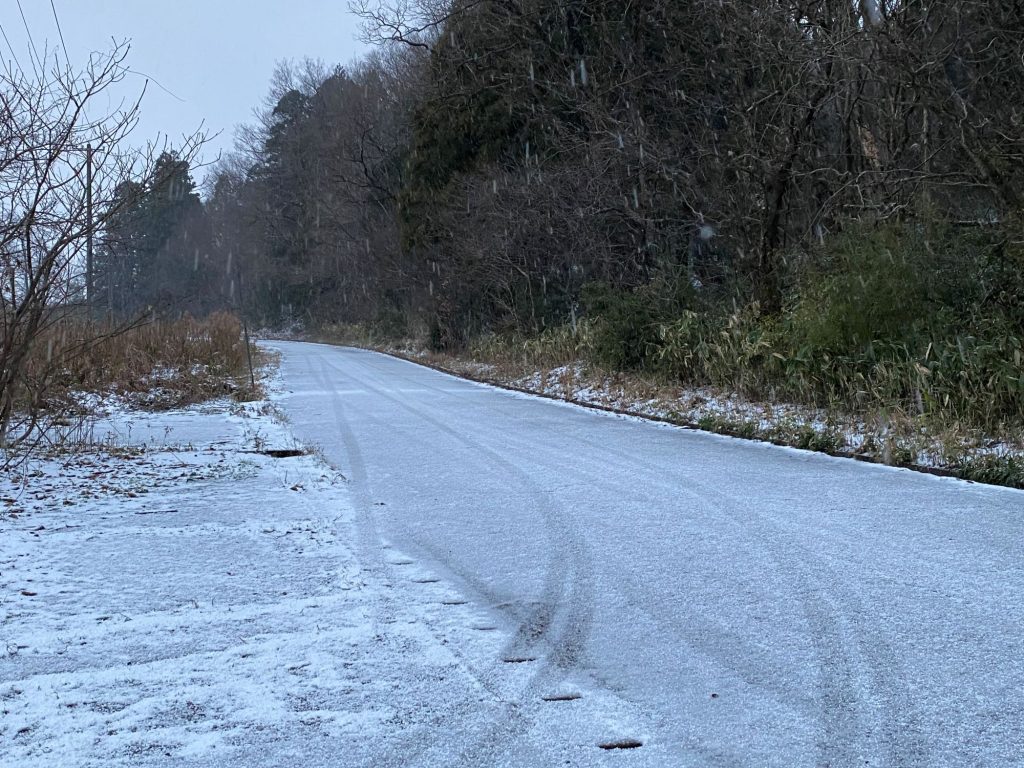 おはようございます。昨夜から風が止み、冷え込んできたので20㌢くらいは降ると覚悟していたのですが、先にずれたようです。雪はうっすらとしか降りませんでした。問題はこれから先です。ぐんと冷えてきていますので、確実に降るでしょう。下は今朝の地元事務所脇の市道です。
