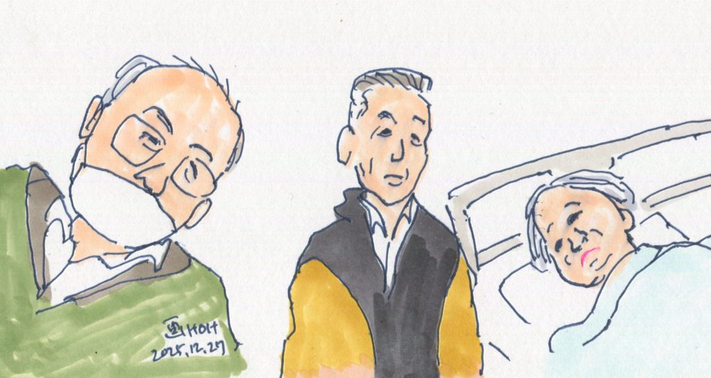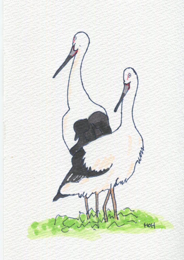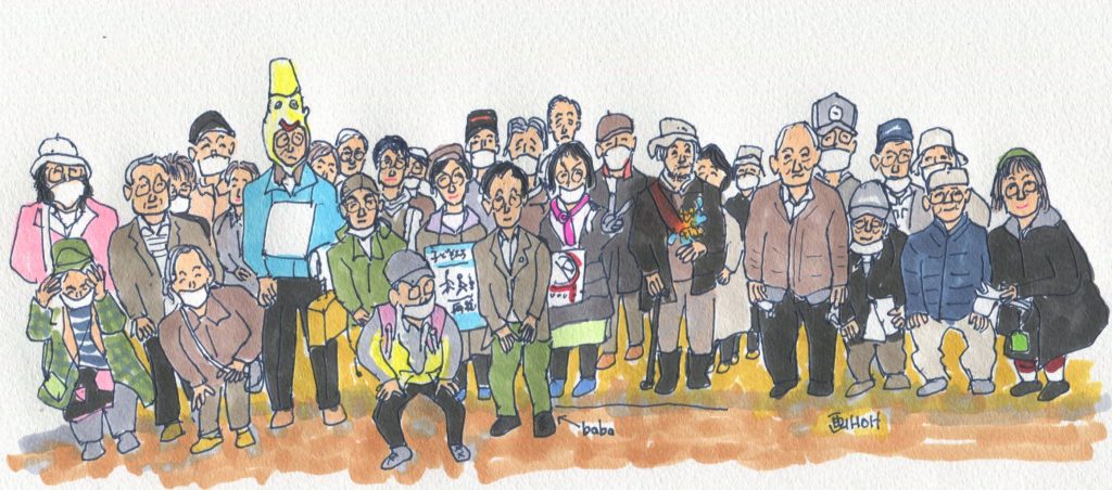昨日は日本共産党上越地区委員会事務所の日直でした。電話が数本入ったくらいで、時間がありましたので、11月25日、新潟県庁を囲んだ〝人間の鎖〟行動に参加した上越地域の人たちが集まった時の写真をもとにした絵を描きました。真ん中に馬場県議の姿があります。この日も上越市選出の牧田県議、土田県議、馬場県議が頑張っていました。この絵の他、年賀状に使うコウノトリ、闘病中の従姉を見舞う従姉の子どもと私の姿も描きました。人間の肌に使っていた色がなくなってきて、薄くなってしまいました。お許しください。以下はその3枚です。