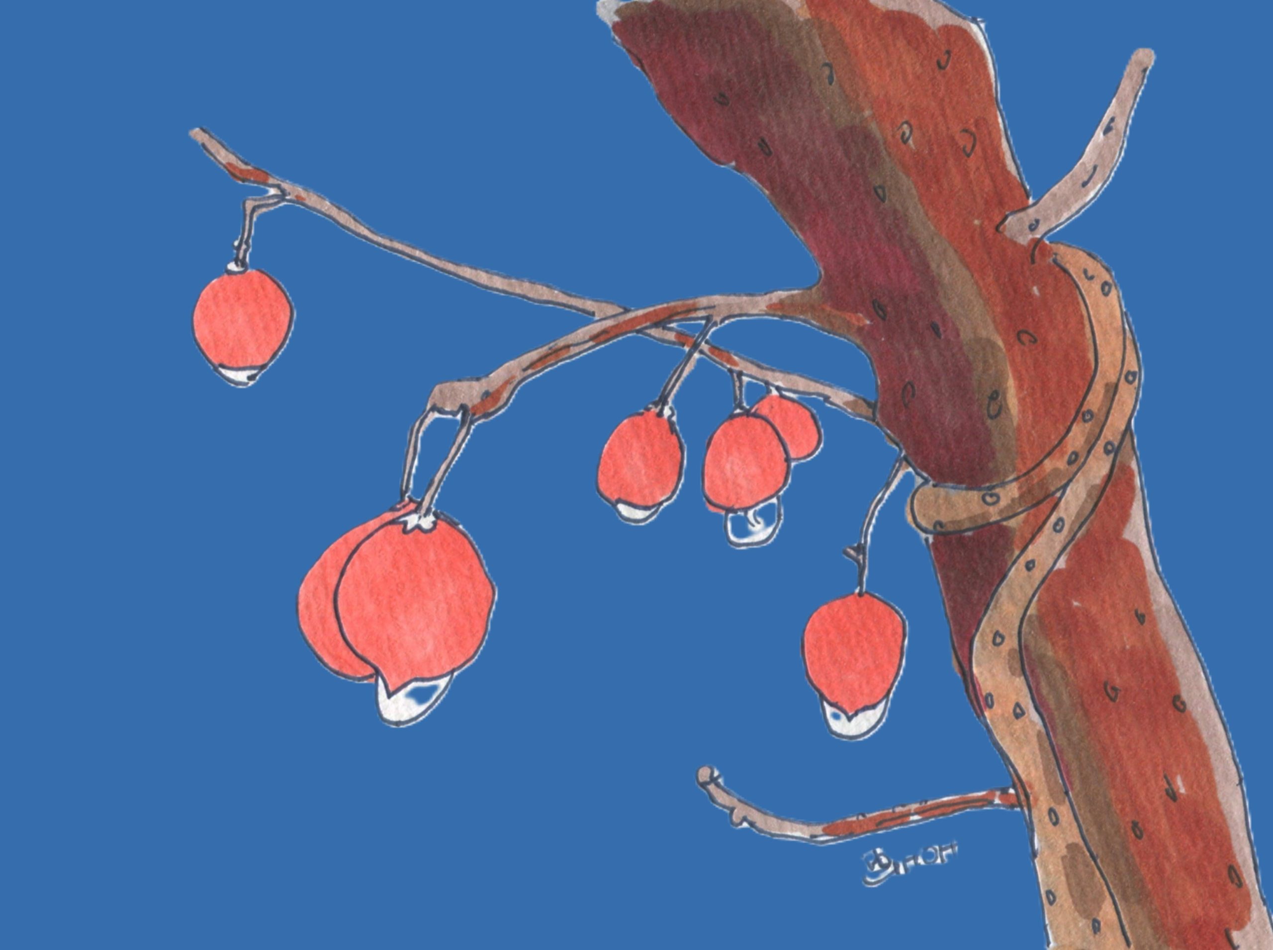 トップのイラストは地元事務所脇にあるツルウメモドキの赤い実を描きました。実際はあいにくの雪模様ですが、バックはめでたく青空にしました。