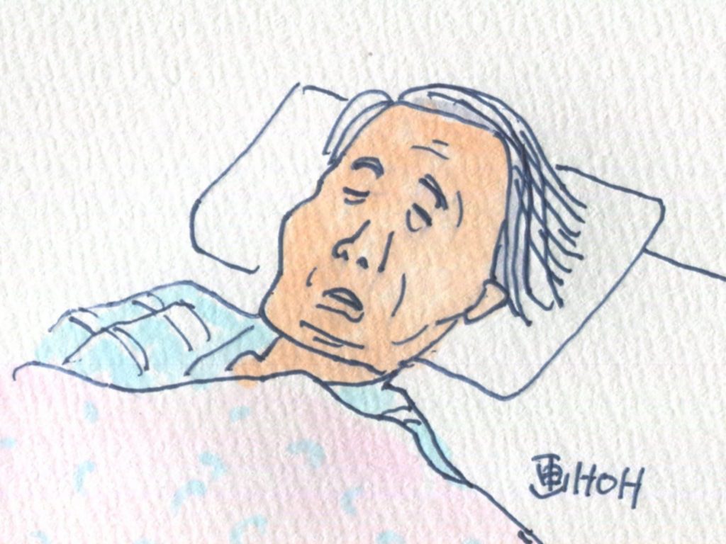 連れ合いと一緒に戻ってから、従姉が入所している施設へ行ってきました。大雪の影響もあって、入れるかなと思ったのですが、大丈夫でした。従姉はちょうど睡眠中でした。顔を見ていたら、頬骨が出ているところ、顎(あご)の形が母親や私の母とそっくりでした。10分ほどで施設を離れましたが、従姉の子どもが行った時には目を開けていたそうです。下は従姉を描いたものです。