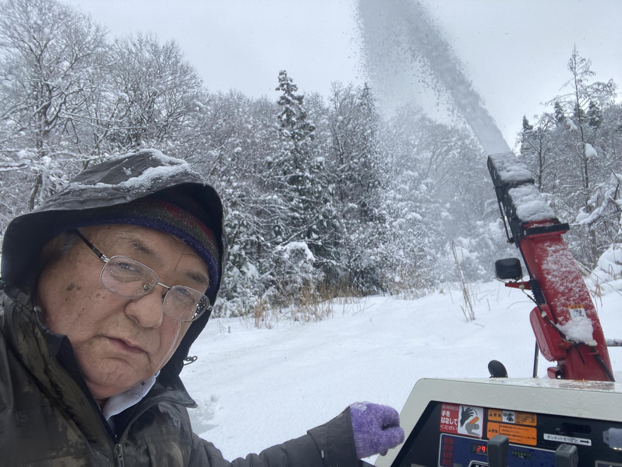 昨日も除雪機を稼働させました。自宅前を約1時間かけて除雪した後、事務所に向かいました。事務所前の駐車場をきれいに除雪し、事務所の屋根雪が落ちる場所の西側を先に終わらせ、東側を除雪し始めてまもなく、回転部に青いものが回っています。窓の下にあった古いブルーシートを巻き込んだのです。それで作業をストップし、事務所前でこのシートを除去することに専念しました。ところが、ブルーシートは半端な量ではなく、しかもがっちりと機械の隙間に食い込んでいます。大きな剪定鋏とカッターを使い少しずつ除去しました。これに1時間くらいかかりましたが、途中でやめました。軍手をしていたのですが、作業をしにくく、素手でやっているうちに手が冷たくなり、びりびりしてきたのです。「こりゃ、だめだ」と作業を止め、事務所に入ってお湯で手を洗い、温めました。でも、午後になっても手の痛みは取れませんでした。トップ画像は除雪作業中のものです。