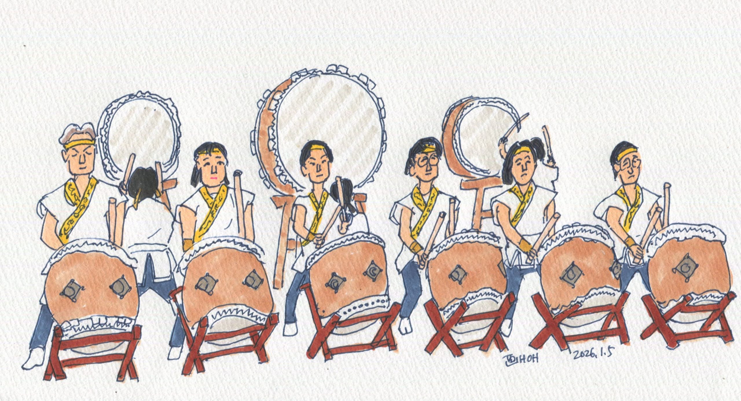 というわけで、会場入りは15分前でした。遅くなったと思いましたが、オープニングに十分間に合いました。今年のオープニングは「春日山謙信流陣太鼓」の演奏でした。今回は写真を撮るために、最前列に陣取り、何枚も撮影させてもらいました。出来るだけ似顔絵風にしたいと思ったので、演奏者の顔がよく見える位置から写真を撮りたいと思っていましたが、この点はばっちりでした。トップのイラストは何枚かの写真をもとに描きました。