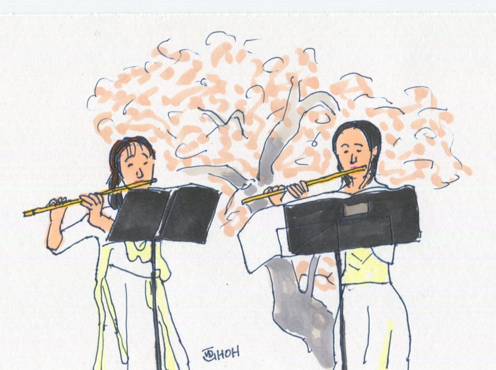 続いて、渡邉市議会議長がはきはきした言葉で、いまの上越市の発展のために果たすべき市議会の役割をコンパクトに語りました。その後は賀詞交換会です。舞台ではフルート奏者の高橋由美さんと仲野享子さんが松任谷由美の「春よ来い」などの演奏をしてくださいました。この時間帯では、吉川区や大島区などのみなさんのところへ挨拶に行ったのですが、みなさん、一斉に動いたので、挨拶したかった人に何人も会えませんでした。まあ、2千人からの人たちが参加する会ですから、しょうがないです。下はフルート演奏風景です。