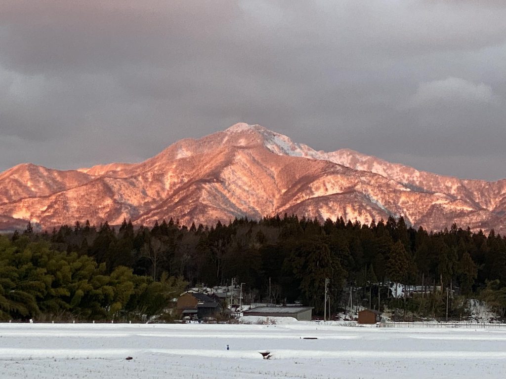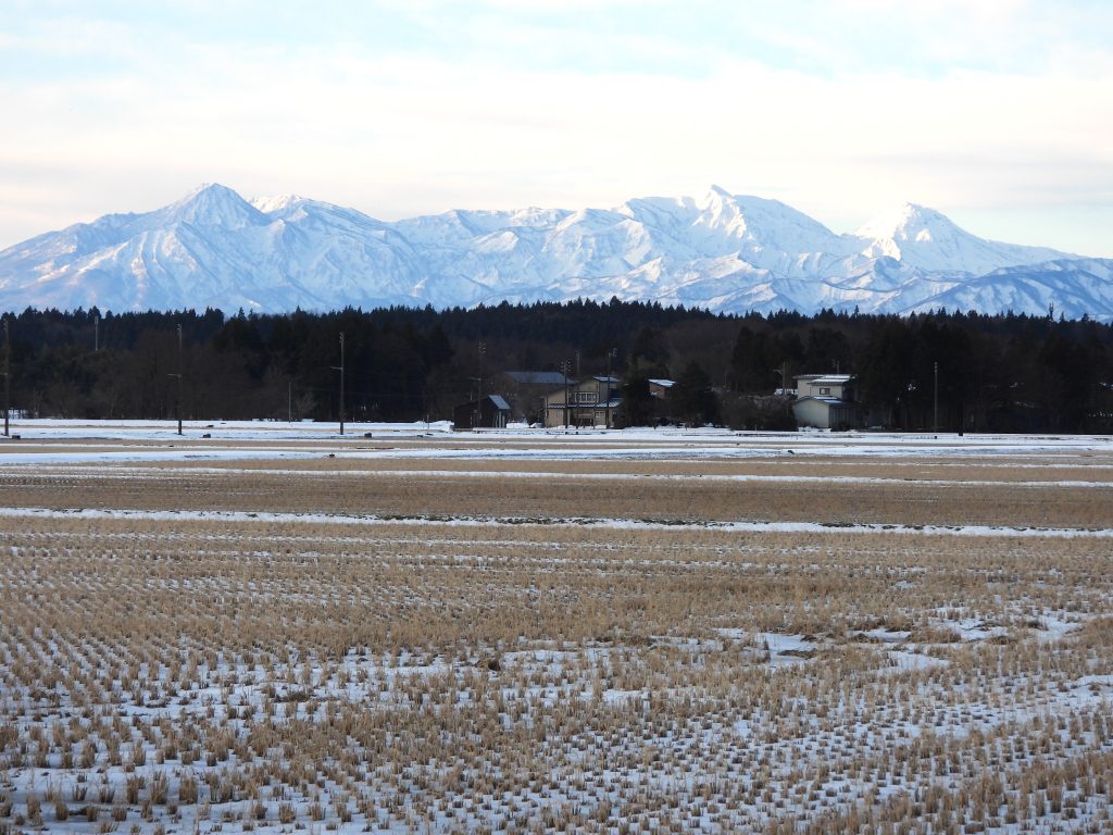 おはようございます。今朝は7時になって起きました。外は晴れです。ゴミ出しに行ったついでに頸城三山などの山々を撮ってきました。今朝は思っている以上に冷え込み、凍み渡りができました。下の画像は柿崎区百木にて撮影したものです。