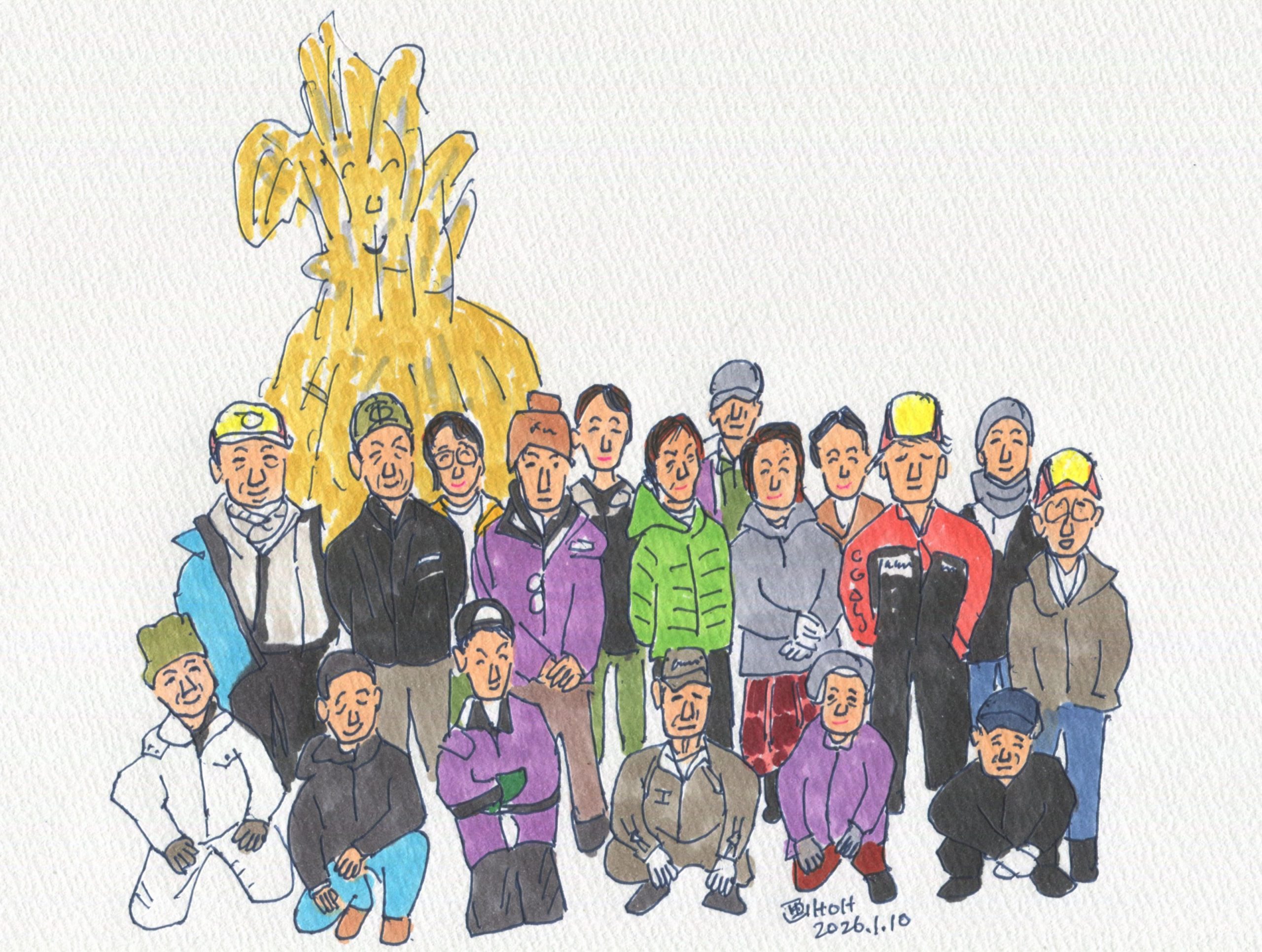 午後からは大島区菖蒲東でのサイの神の取材でした。点火する前に参加者から集まってもらい、集合写真を撮りました。全員で20人ほどでしたが、みなさん元気でしたね。そば打ち名人さん夫婦、生産組合メンバーなど顔見知りの人がほとんどでした。山間部とはいえ、風が強く、点火してからは7分ほどで燃え落ちました。下は点火直後の画像です。何か叫んでいる怪獣のように見えます。集合写真の一部を使ってイラストにしましたが、トップのイラストがそれです。