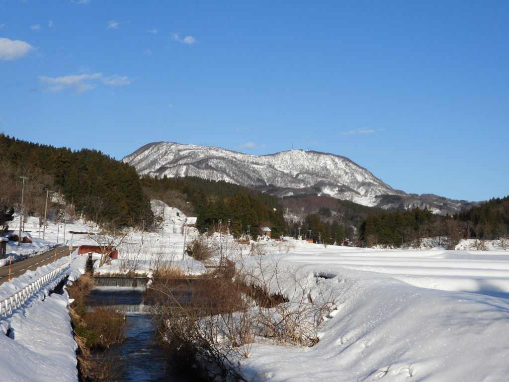 午前の遅い時間帯には吉川区の山間部へ行きましたが、海が青く見えたのには驚きました。冬の海は灰色というイメージが強いのですが、夏の海と勘違いしそうでした。下の画像は吉川区の川袋から撮った尾神岳です。ここでの撮影は久しぶりでした。
