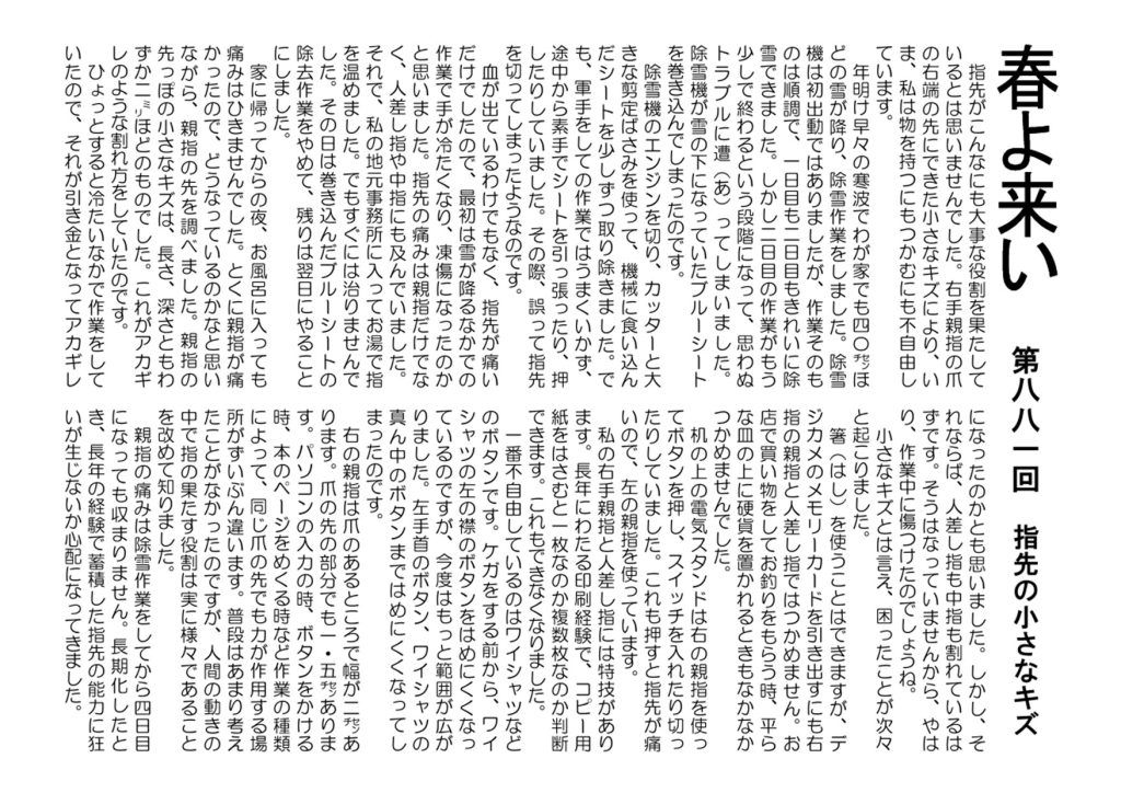 活動レポート2234号、「春よ来い」シリーズの第881回、「指先の小さなキズ」をホームページに掲載しました。下線のついたところにタッチしてご覧ください。