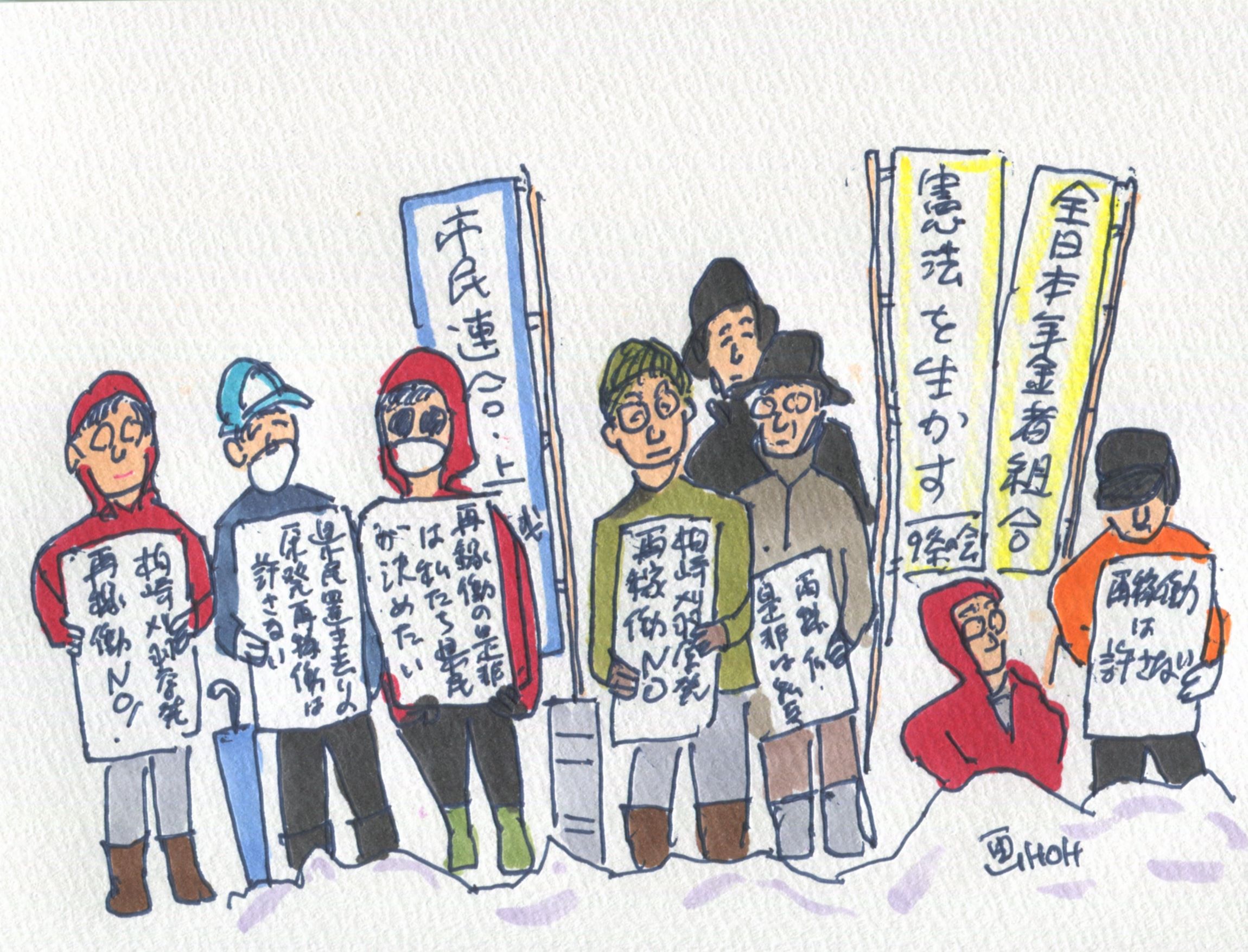 昨日は午前にデスクワークをしました。党務での原稿書きです。それが一区切りした段階でカニ池交差点に向かいました。そこでは柏崎刈羽原発再稼働に抗議するためにスタンディングをしようと、反原発のグループの人たちが呼びかけていました。あいにくの悪天候でしたが、8人がプラスターなどを持ってアピールしました。トップの画像はその時の模様を描いたものです。
