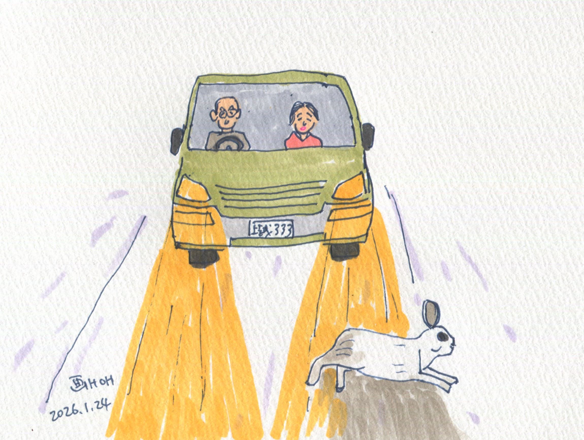 夕方、体がぐったりしたので近くの温泉に行ってきました。土曜日はいつも混むのですが、大雪のためお客は少なめでした。その帰り道、ウサギと出合いました。今冬になって初めてです。最近は足跡も見ていませんでした。その場面をイラストにしました。トップのイラストがそれです。
