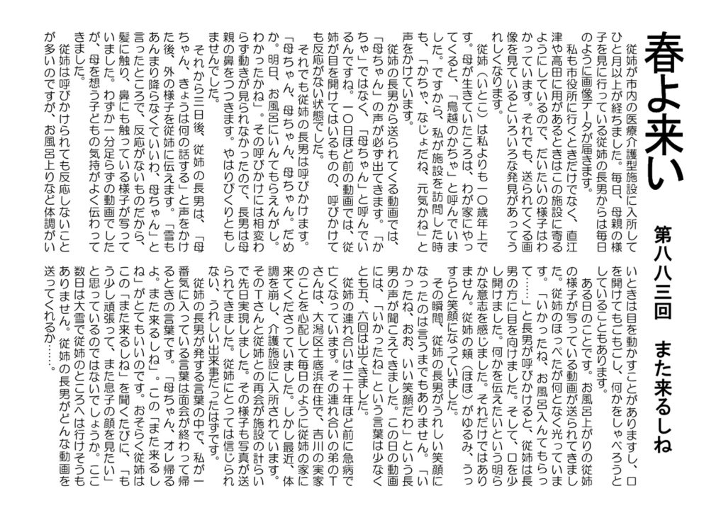 活動レポート2236号、「春よ来い」シリーズの第883回、「また来るしね」をホームページに掲載しました。ご笑覧ください。