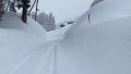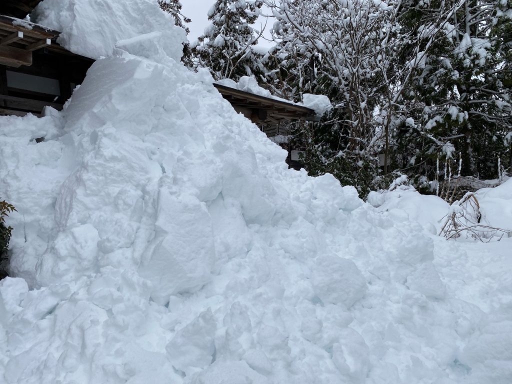 夕方の除雪作業は木戸先だけでなく屋根下の雪も除雪しました。昨日の雪は重く、滑りやすい雪で、大屋根の雪はほとんど落ちました。それを除雪したのですが、残っていたものは今朝の段階でまた落ちました。下の写真がそうです。
