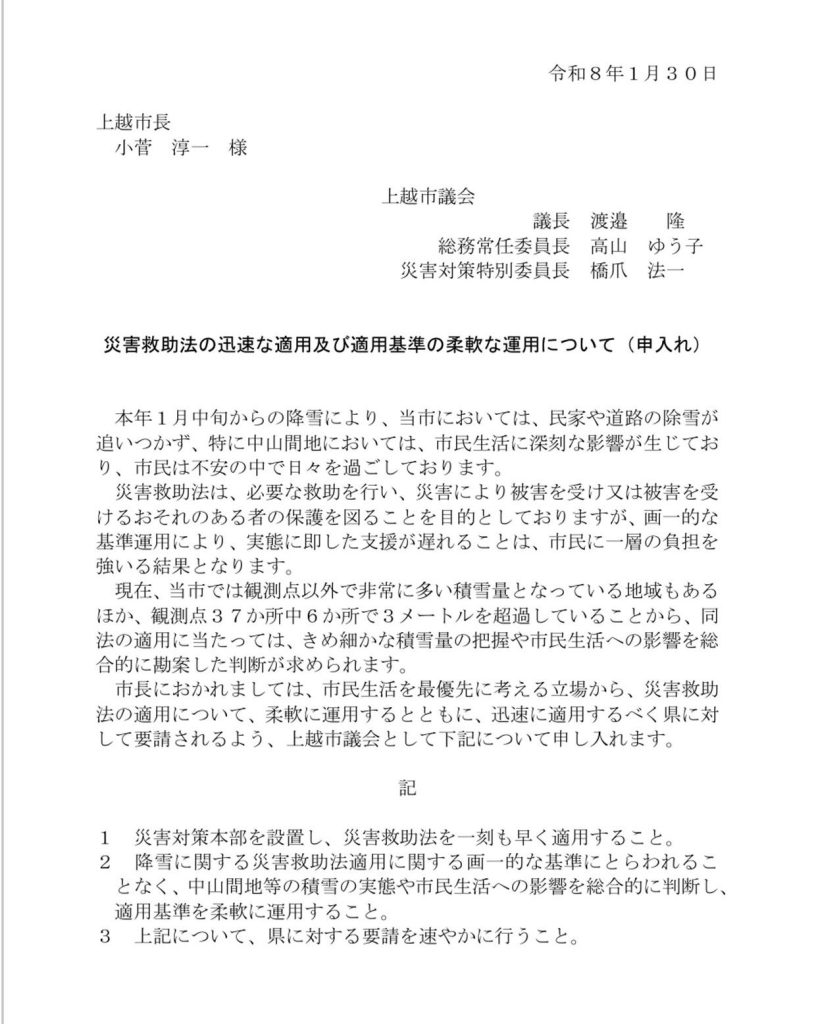 昨日は臨時市議会でした。少し早めに家を出て、途中で、大島区総合事務所に電話を入れたら、田麦で9時現在、3㍍90㌢にもなっていました。菖蒲でも3㍍37㌢です。市役所に着いて、他区の積雪状況も調べたら牧区棚広新田で3㍍76㌢、清里区棚田で3㍍10㌢など6観測地点で3㍍超えをしていました。それで、議長と総務委員長、そして災害対策特別委員長である私とで緊急3者会談を行い、昨年と同じように議会として市長に災害救助法の適用などで申入れしようということになりました。ただ、関係委員会の委員の声を聞いたうえで正式に決めるべきだということから、昼休みに総務委、災害対策特別委の全メンバーに集まってもらい協議しました。その結果、全員一致で正式に申入れが決まりました。この間、議会事務局の人たちには急な動きに対応して頑張ってもらいました。感謝です。
