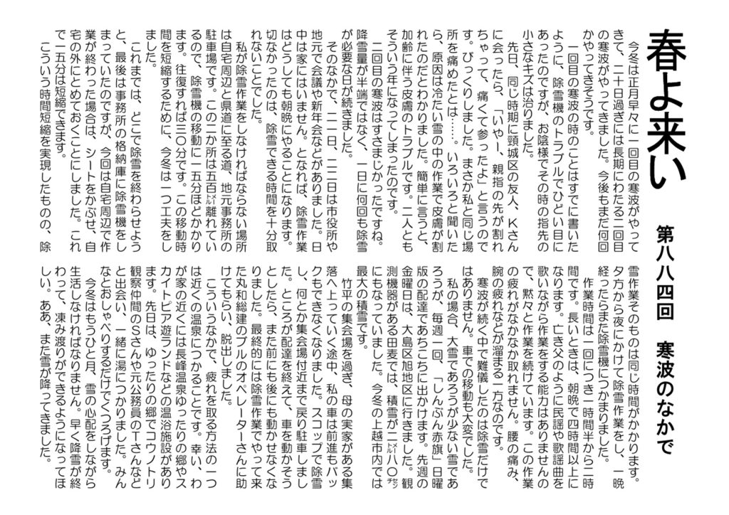 活動レポートは既報のように第2237号をすでにホームページにアップしてあります。また先ほど、「春よ来い」シリーズの第884回、「寒波のなかで」を掲載しました。ご笑覧ください。