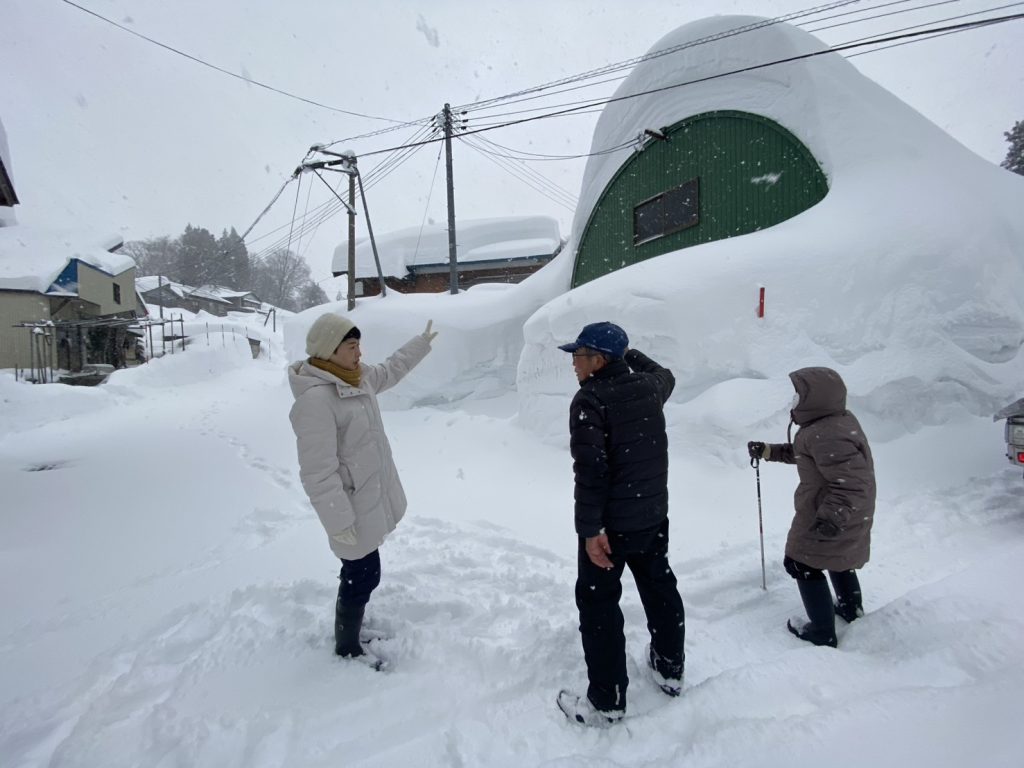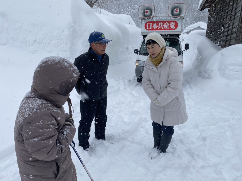 演説後、平候補は田麦集落に入り、大量の雪が民家の屋根や周囲に降り積もり、危険な状態になっている様子を視察し、案内してくださった住民の声を聴いていました。案内をしてくださった住民の一人、山岸久雄さん(78歳)は、「ケガで入院した人もいる。要援護世帯だけでなく、大雪で困っている住民を支援してほしい」「昨年は県の原子力災害避難訓練がここでもあったが、今年は昨年の倍は降っている。逃げようにも逃げられない」などと訴えていました。こうした声を国政に届けるには日本共産党の議席がどうしても必要です。