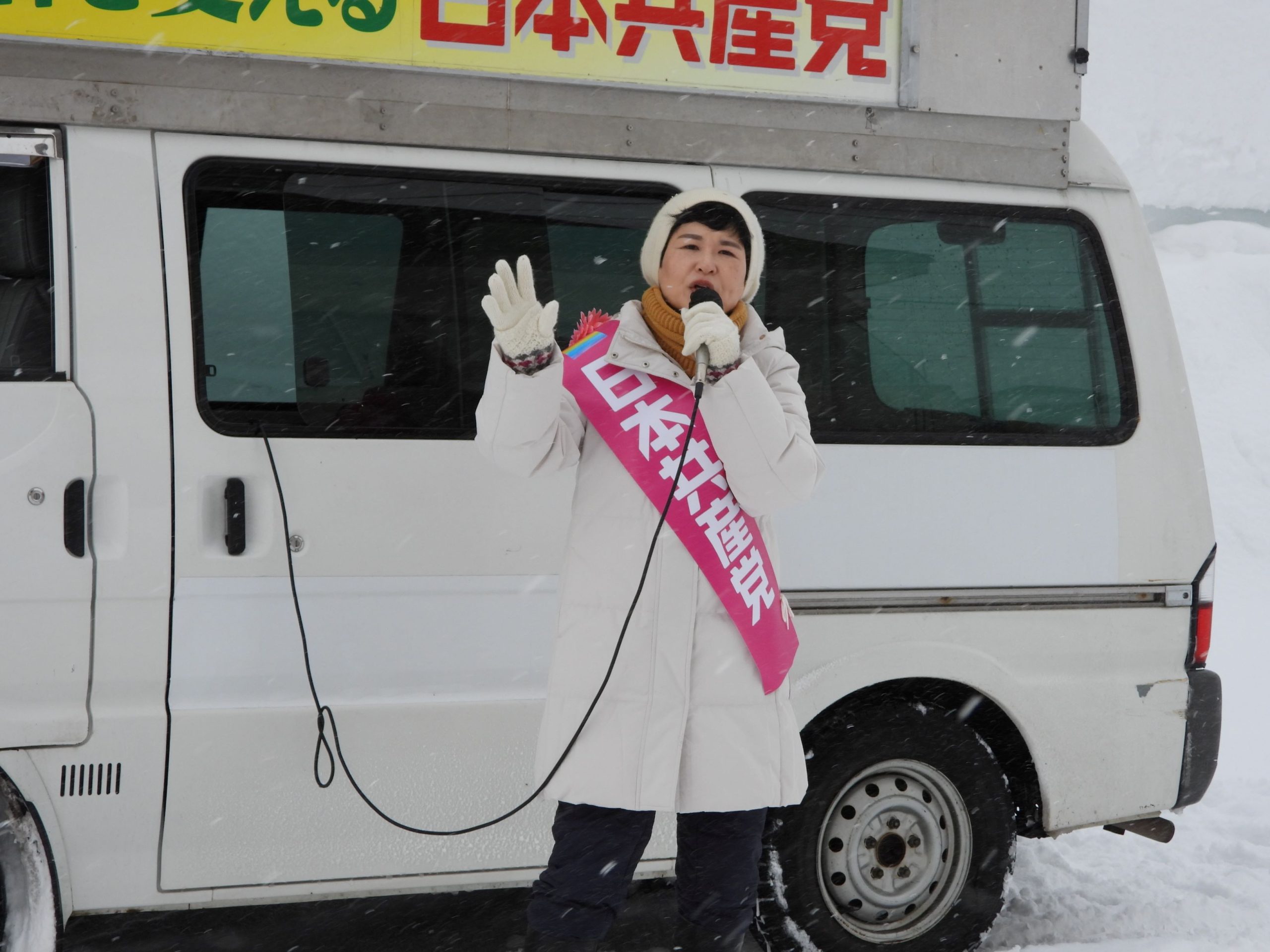 平候補は、集まった地域の住民のみなさんを前に、「これほどの豪雪のなかで大義の無い選挙を強行した高市政権はおかしい。上越市議会は昨日、市長に災害救助法の一時も早い適用を県に働きかけてほしいと要請したが、日本共産党も頑張る」「ここは柏崎刈羽原発から遠くない。万が一過酷事故が発生しても逃げられない。再稼働したもののトラブル続きでまた止まっている。再稼働はおかしいという意志をこの選挙で示そう」などと訴えました。4㍍ほどの雪の壁を前に前に演説した平候補に住民は大きな拍手を送っていました。トップの画像は演説の様子です。