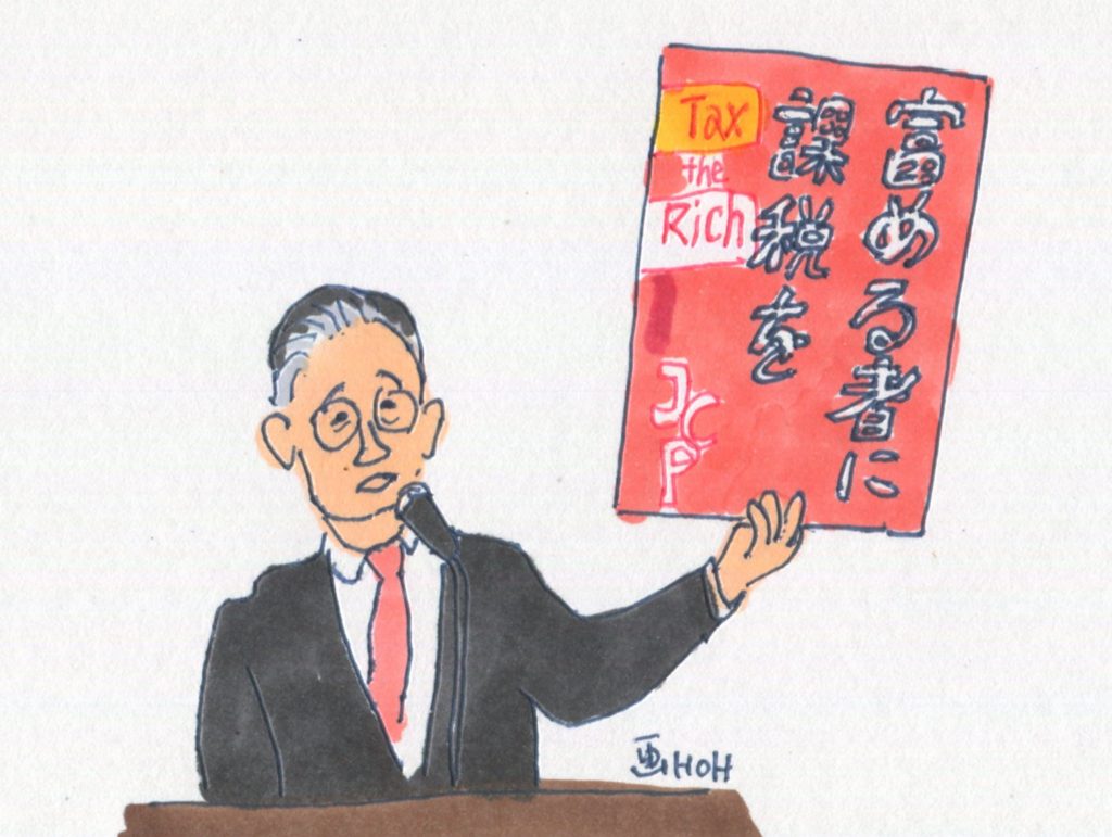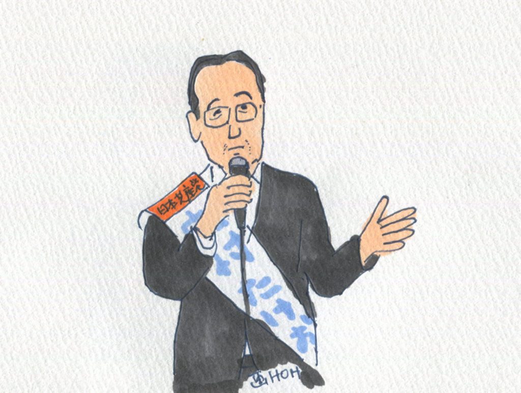 昨日の夕方は、新潟市で小池晃書記局長を迎えての日本共産党演説会がありました。遠い上越市からは駆けつけるのが大変なので、あちこちで視聴会をやりました。大潟区では南部堂の喫茶コーナーを借りて、コーヒーをいただきながらインターネットで視聴しました。1人でパソコンに向かって見るより、みんなで声を出し合いながら見るのもいいものですね。演説会では、応援に駆け付けた市民連合@にいがた共同代表の佐々木寛さんは、立憲主義を守るためにも比例で日本共産党をと訴えてくださいました。藤野やすふみさんは原発問題のエキスパート、いまの原発再稼働の危険性を浮き彫りにしました。小池書記局長はジョークが上手すぎです。顎が外れそうになるほど笑いました。とても楽しくて、ためになる演説会でした。下のイラストは佐々木さん、中村たけおさん、藤野さん、小池さんの順です。