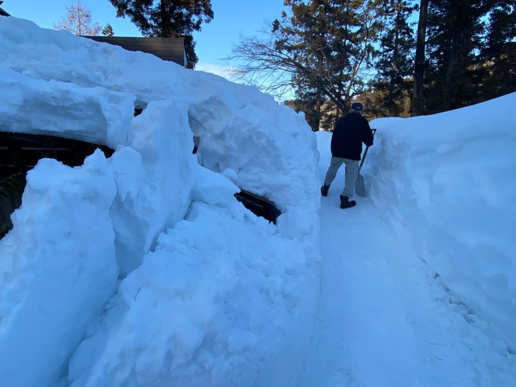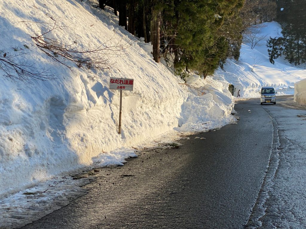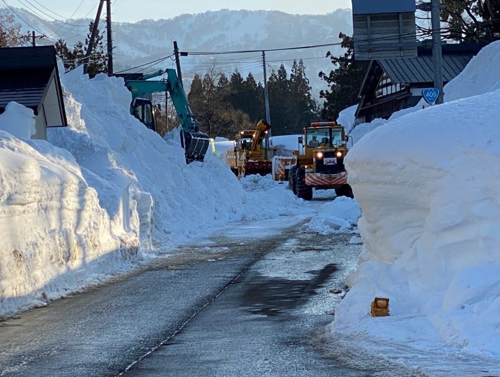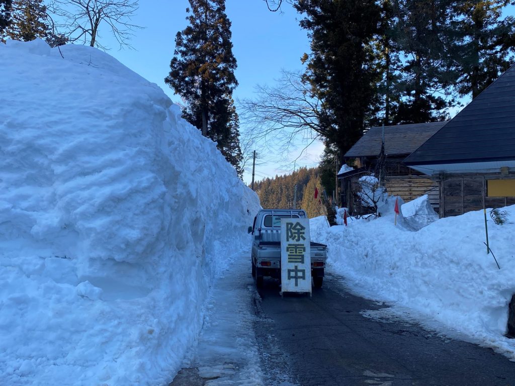 その後、大島区に向かいました。災害救助法適用後の様子をこの目で確認しておきたかったからです。昨日は大島、菖蒲地区に入りました。注目したことの一つは要援護世帯など支援が必要な民家がどうなっているかです。熊田では一人暮らしの方が、「ユンボによる除雪をお願いして、きょう来てくださるということだったが、申し込みが相次ぎ、きょうは無理の様だ」と心配されていました。二つ目は道路です。いまのうちに道を広げておかないと除雪できなくなること、雪庇落としがどうなっているか注目しました。天気が良かったこともあって、国道から市道に至るまで急ピッチで排雪作業が行われていました。ただ、業者は雪庇落とし、道路排雪のどちらも並行してやることは難しく、道路の排雪が優先されていました。道路わきの雪庇の崩れが心配なところです。