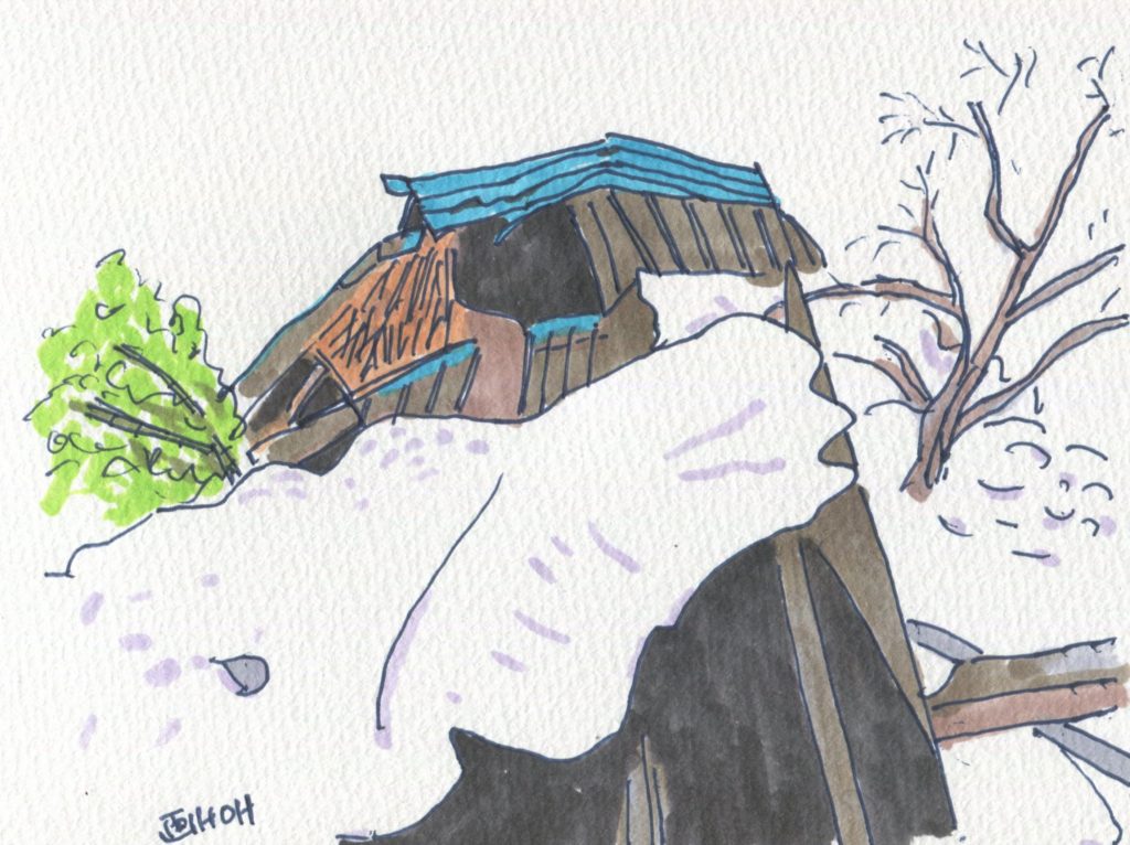 三和では、岡田の雪による死亡事故があった2軒の家も訪ねてきました。夏場と違った風景でもあることから、家が見当たらず、困って元市議の橋本さんへ電話したところ、ちょうど同じ集落で支持を訴えていたので、案内してもらいました。どちらの家も忌中札は見当たらず、改めて一人暮らしの厳しさを感じました。60代の男性が窒息死した家ですが、屋根の崩れは今回の大雪の時のものだけではない感じがしました。下は崩壊した家のスケッチです。