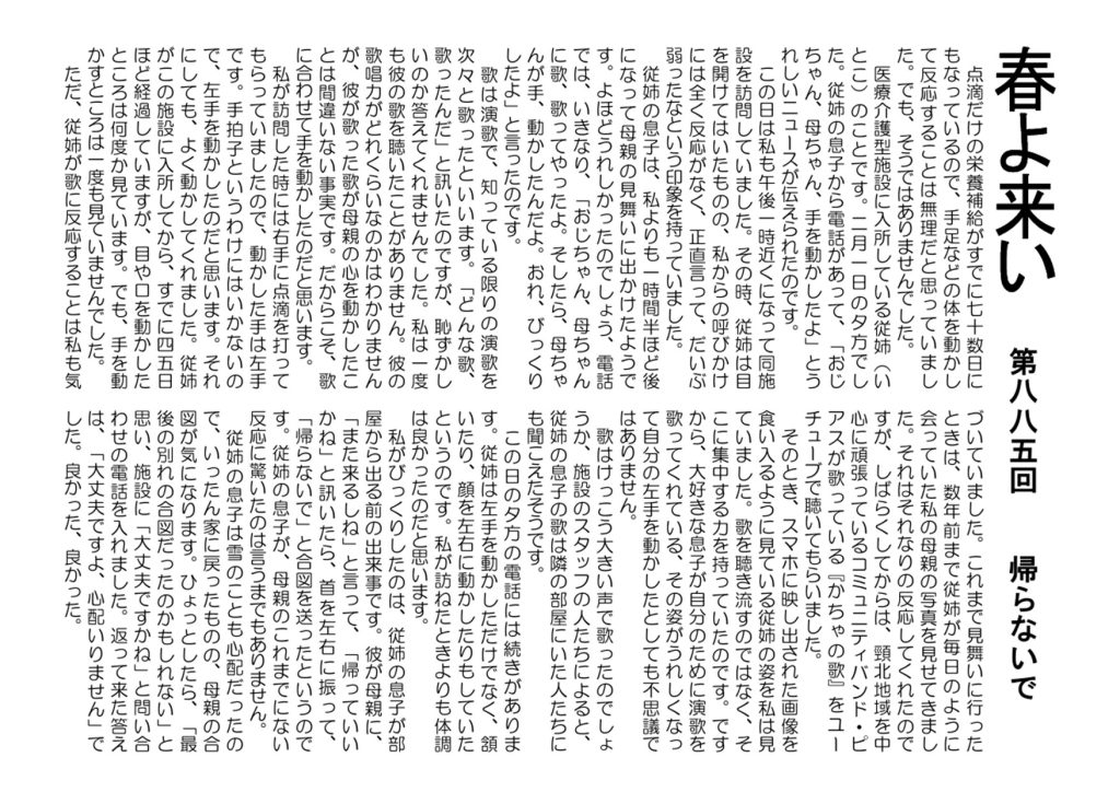 活動レポート2238号、「春よ来い」シリーズの第885回、「帰らないで」を私のホームページに掲載しました。ご笑覧ください。