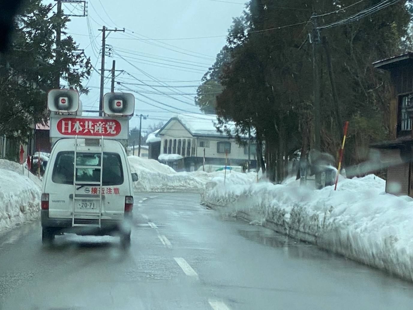 昨日はまず、地元の旭地区(吉川区の)で「しんぶん赤旗」日曜版と活動レポートを配達し、その足で、頸城区、三和区へと車を走らせました。私から「比例は日本共産党へ入れてください」とお願いしたい家が何軒かあったからです。頸城区では聞いたことのある声がすると思っていたら、日本共産党の政党カーでした。大急ぎで追いつきました。その時の写真がトップです。