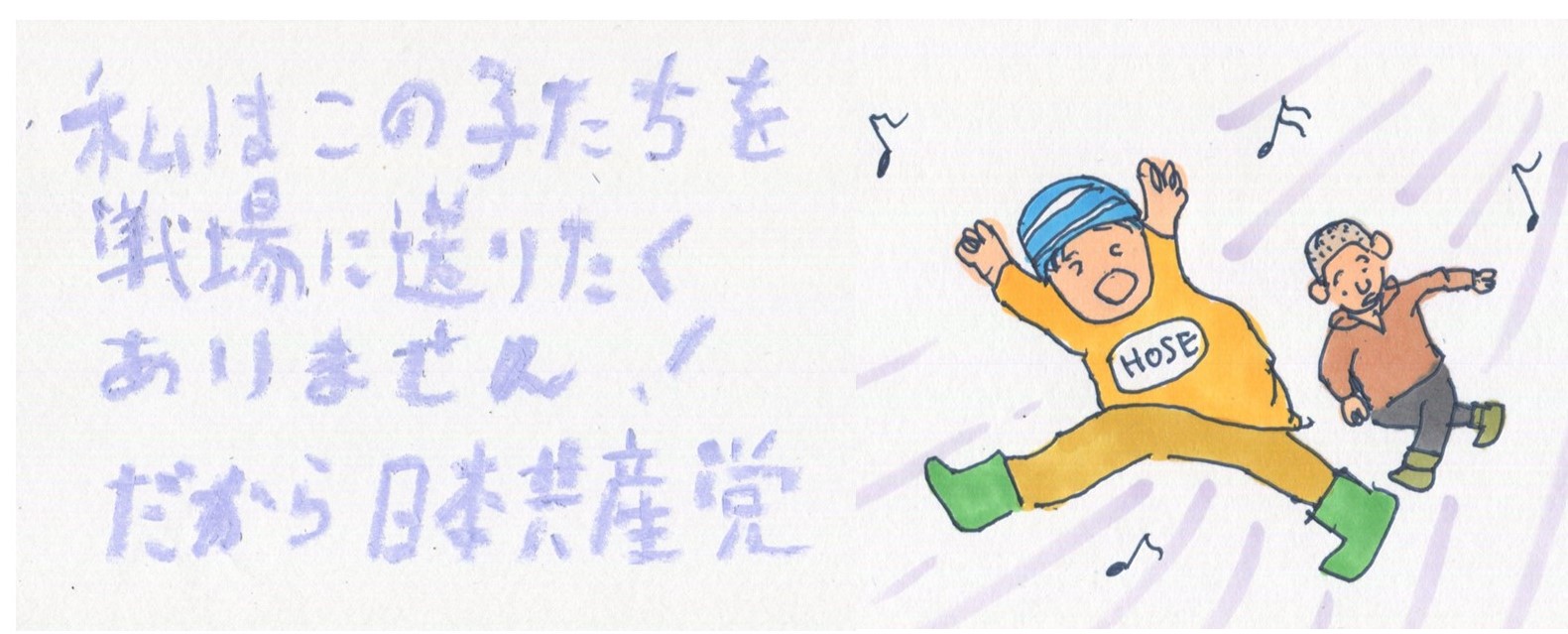 衆院選の選挙活動は今夜の11時59分59秒までとなっています。最後にどう訴えようかと考え、一枚のイラストを活用したものを作りました。トップ画像がそれです。子どもたちを戦場に送ってはなりません。党をつくって104年、平和と民主主義のために頑張ってきた日本共産党を伸ばしてください。そのためには「比例は日本共産党」と書いてくださいますよう心からお願いします。