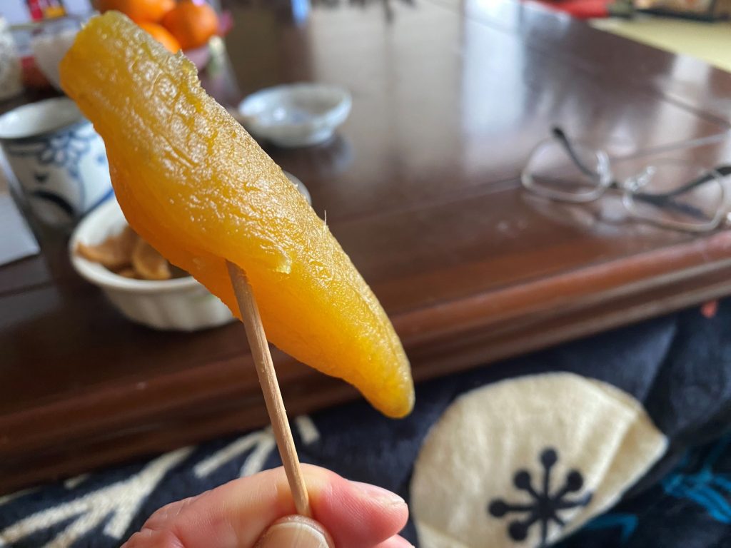 午前も午後もそれぞれ1軒でお茶をご馳走になりました。午前にお茶をいただいた家では、ハリハリ漬けやサツマイモの丸干しなどを食べさせてもらいました。このうち、丸干しは初めて食べました。しっとり感があって、しかもサツマイモらしい甘さが気に入りました。下がその画像です。