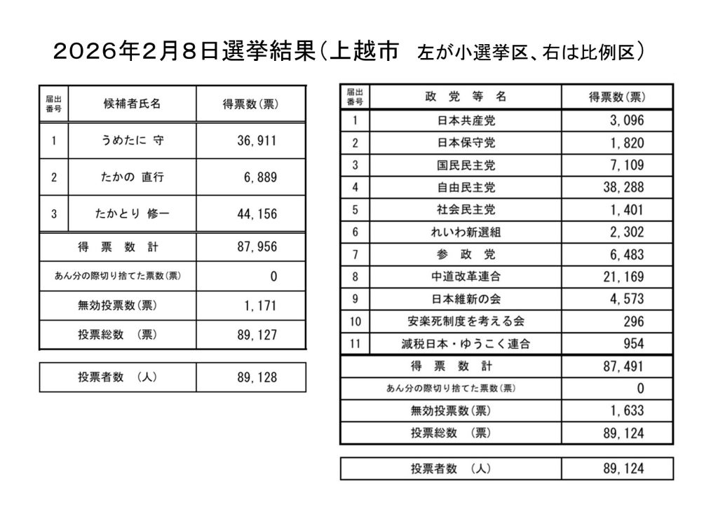 総選挙の開票結果はマスコミが予想した通り、高市旋風が巻き起こり、自民党が大勝しました。そして中道改革連合が激減、日本共産党も半減してしまいました。トランプいいなりで、戦前の政治復活を思わせるような超右翼的な主張をする勢力が大きく伸びたことは信じられません。しかし、これからの政権運営で、物価高が続き、原発を推進する、非核3原則も見直すなどの悪政はそのまま国民が受け入れるとは思えません。そう遅くない時期に矛盾が爆発すると思っています。下は上越市での投票結果です。