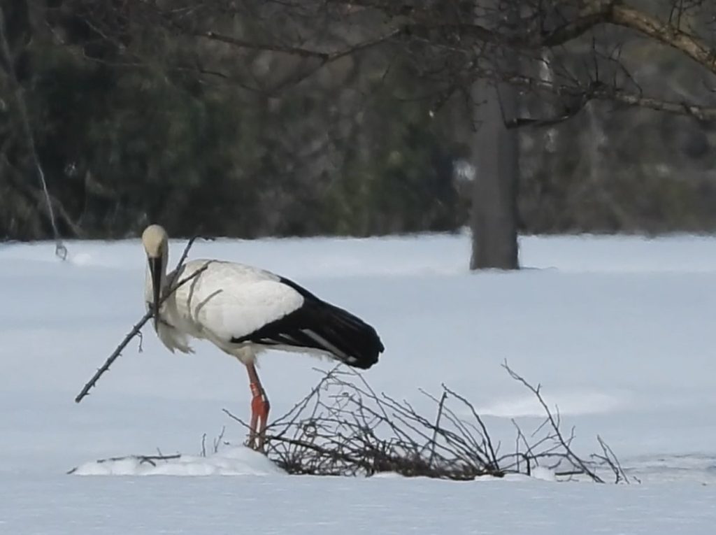 おはようございます。今朝は6時半から約2時間、除雪作業をしました。コウノトリが巣を作るときに必要とする巣材を雪の下から掘り出し、コウノトリのペアが使えるようにするためには、そこに至る道が必要だったからです。