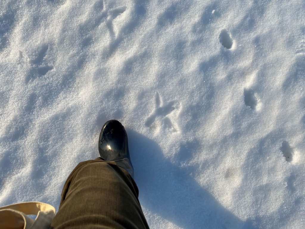 今朝は7時過ぎに外に出て、コウノトリの観察に行きました。昨日の夕方は電柱の上にいましたので、ひょっとすれば一晩中、同じ場所にいるかと期待していましたが、残念ながらいなくなっていました。いつもの観察地点の周辺では今朝も凍み渡りができます。雪の上を歩いていて、コウノトリの足跡らしいものも見つけました。ずいぶん大きい足跡です。