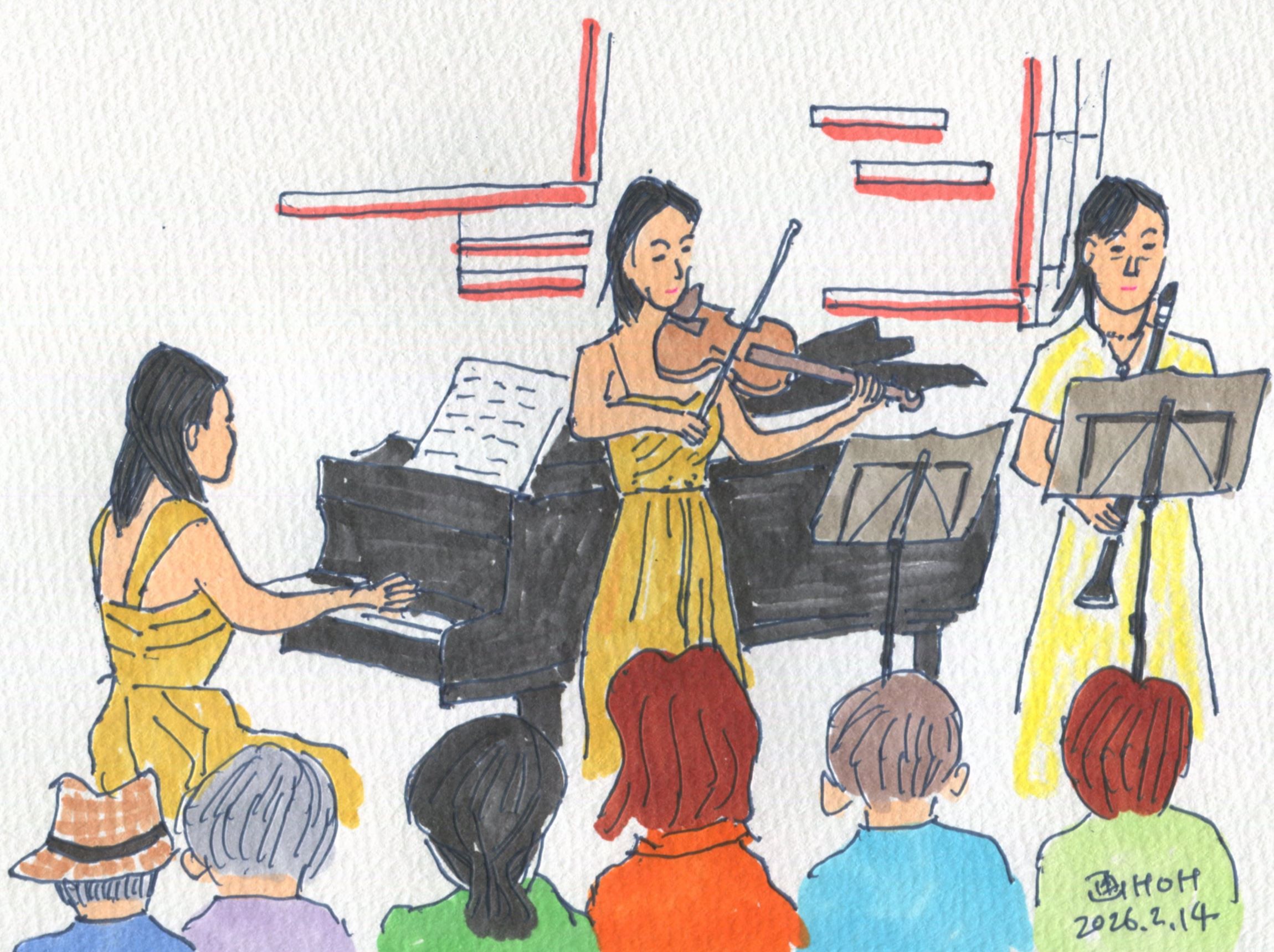 その後、吉川コミプラのホールで開催されていたバレンタインコンサートに行ってきました。主催は「夢をかなえる会」です。出演は、バイオリンの牧田由起さん、クラリネットの丸山瑞生さん、ピアノの上野裕子さん。3人がそろっての演奏は今回初めて聴きました。昔からの名曲もいいのですが、私は「情熱大陸」「春よ来い」など比較的新しい曲の方が気に入りました。昨日は、演奏する曲によって背景の色がどんな色になるかも注目しました。「情熱大陸」はやはり赤が一番ですね。会場では休憩時間に、何人かの知っている人と挨拶しましたが、「この人、誰だっかな」と名前を思い出せない女性が一人いました。間違えば悪いと挨拶もしなかったのですが、お許しください。
