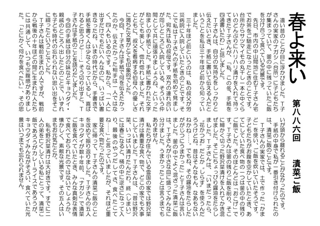 活動レポート2239号、「春よ来い」シリーズの第886回、「漬菜ご飯」を私のホームページにアップしました。ご笑覧ください。