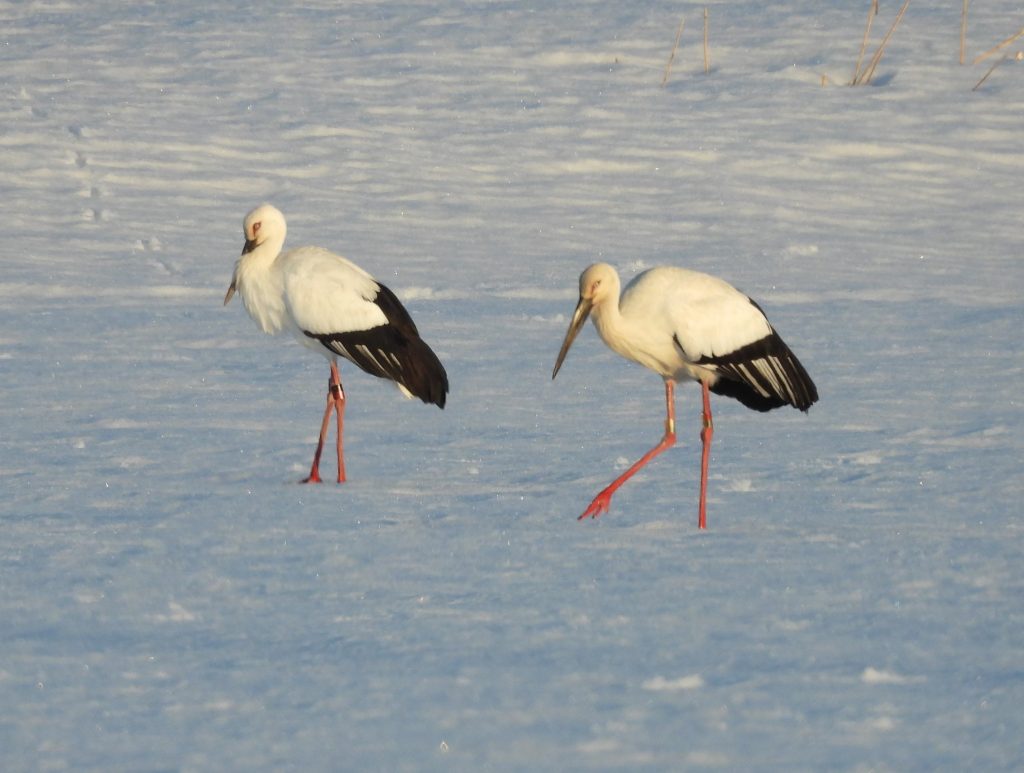 昨日は、市役所で市民団体との意見交換会があり、それに参加してきました。約1時間かかりました。その行き帰りに三和区のコウノトリの巣の周辺で動いているコウノトリの観察をしました。一昨日のように巣や隣の電柱の周辺で繰り広げられたバトルは見られず、3羽とも雪原に降りていました。そこでは時々クラッタリングをやっていましたから、威嚇か愛情表現なのでしょう。私の見た目では、3羽のうち、個体番号の読めない若いコウノトリが徐々に余計ものにされ、個体番号J0239のオスと個体番号J0302のメスが気持ちの上でも近づいている感じがします。今後数日の動きを見れば、定まるものと思います。下の画像は三和のコウノトリたちです。