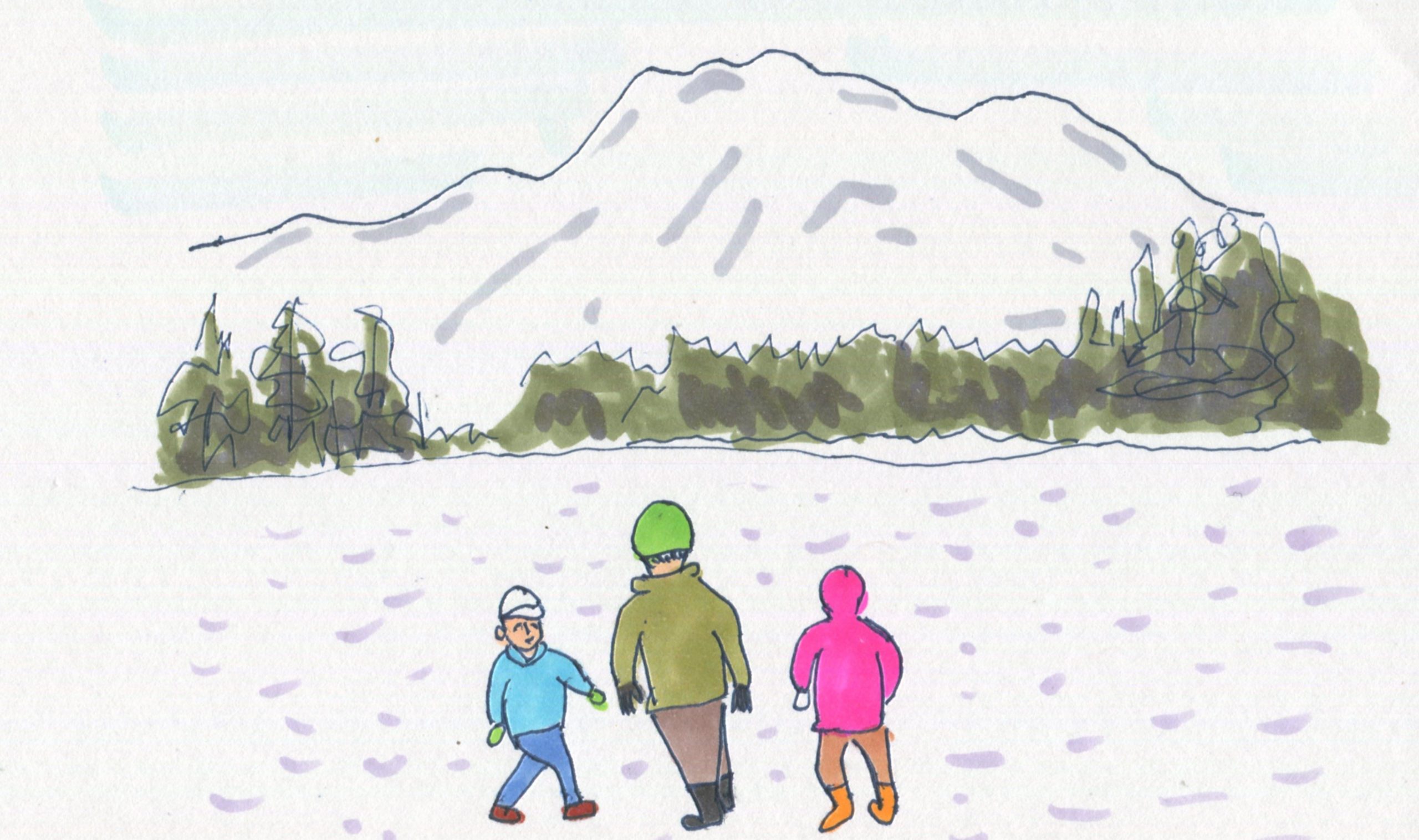 今朝も快晴です。昨日に続いて雪原は凍り、凍みわたりができました。今冬はこれで4回目か5回目です。いつもの冬なら3月にならないとできないことが多いのですが、今年は2月にたっぷりできる、うれしいですね。その思いをイラストにしました。トップのイラストがそれです。