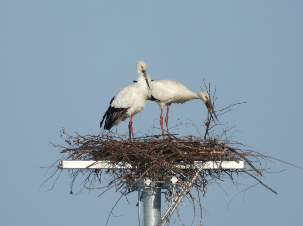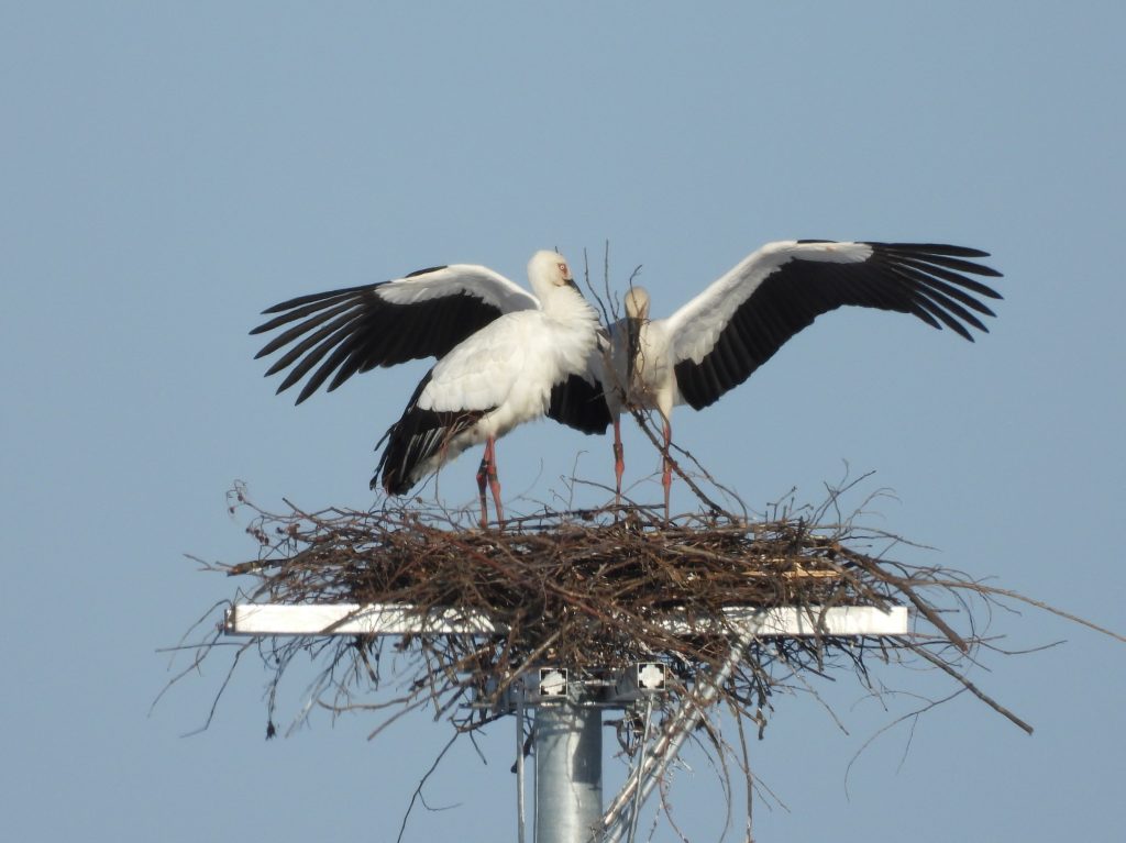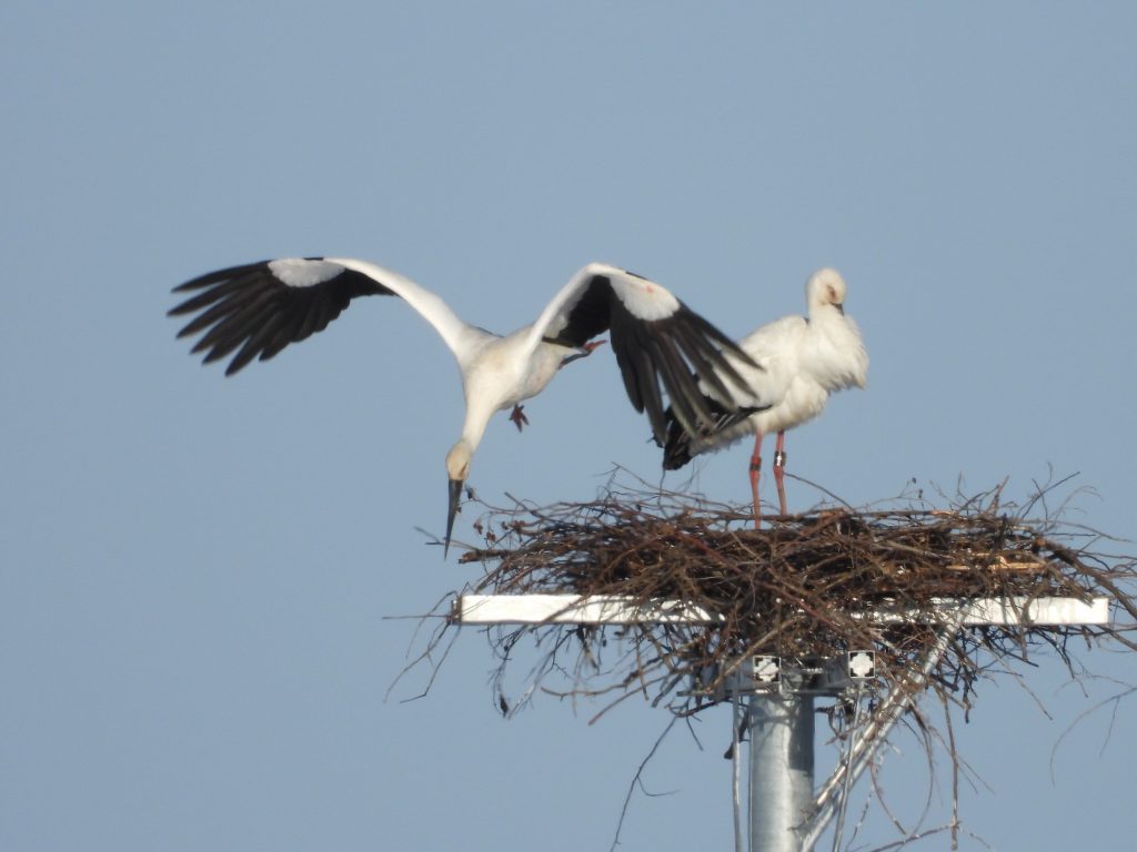 おはようございます。今朝は5時半からイラスト整理、写真整理、コウノトリの観察と大忙しでした。吉川区のコウノトリの巣の再建作業はここ数日の晴天で順調に進んでいます。すでに電柱の頭が隠れるところまで積み上げられました。遠くから見た感じでは、出来上がりの状態の3分の1くらいまで進んだと思われます。下はその様子です。