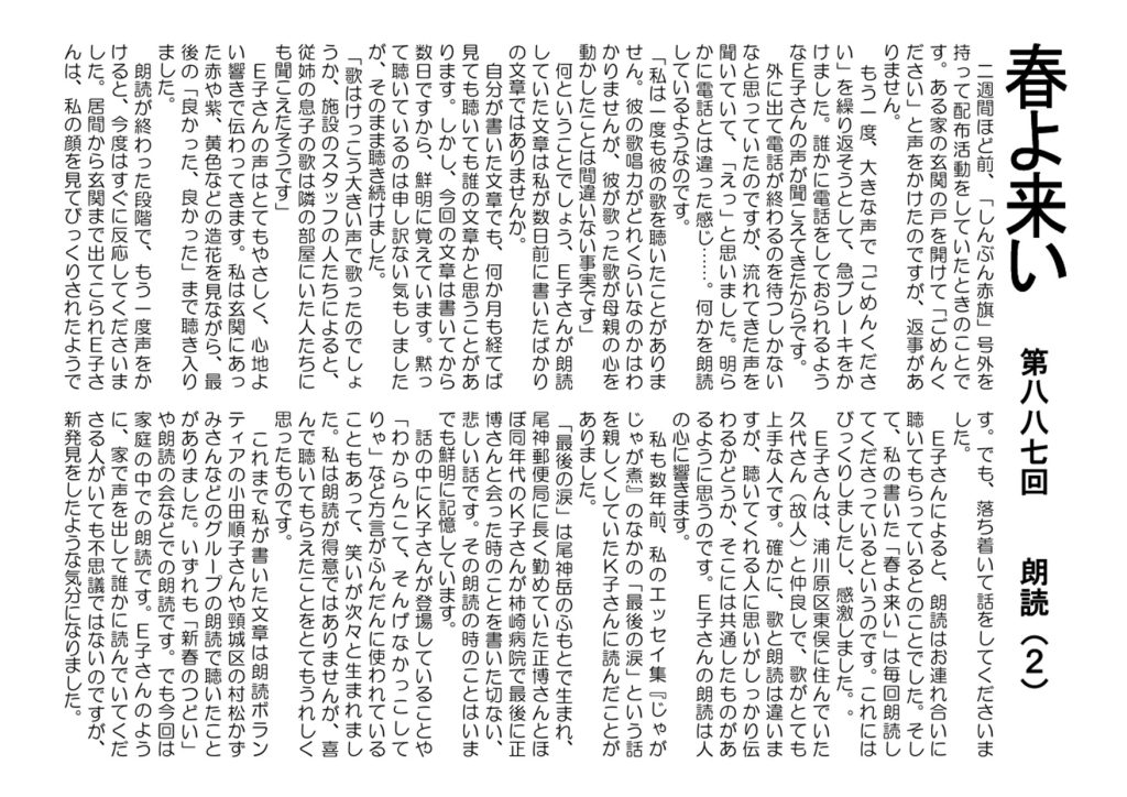 夕方からは党会議があり、帰宅後はホームページの更新作業、イラスト描きなどをしました。市政レポート2240号、「春よ来い」シリーズの第877回「朗読2」は下線の付いたところをクリックしてごらんください。